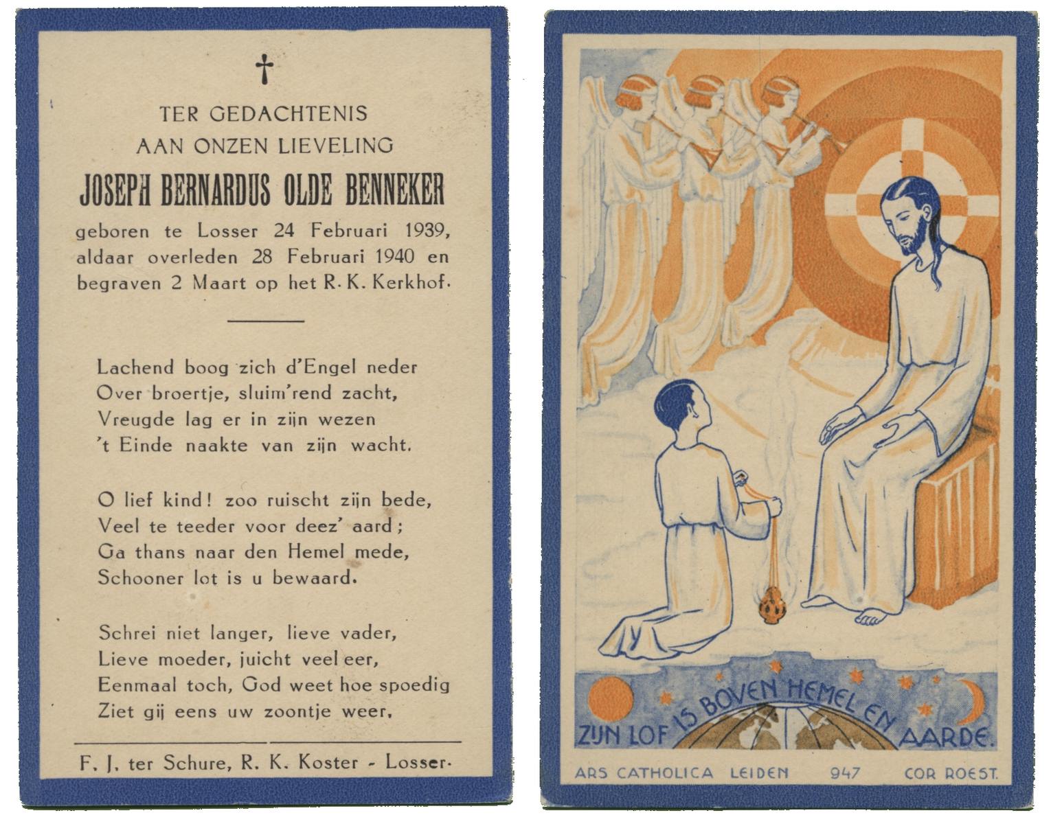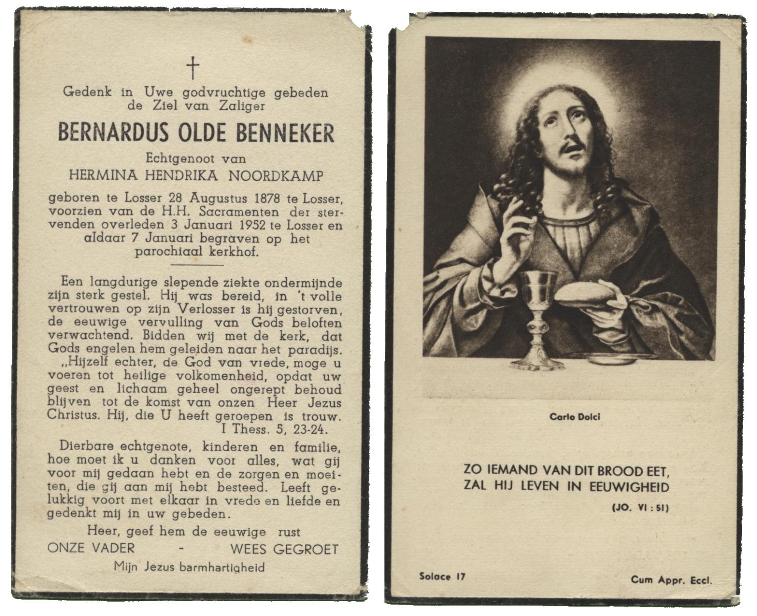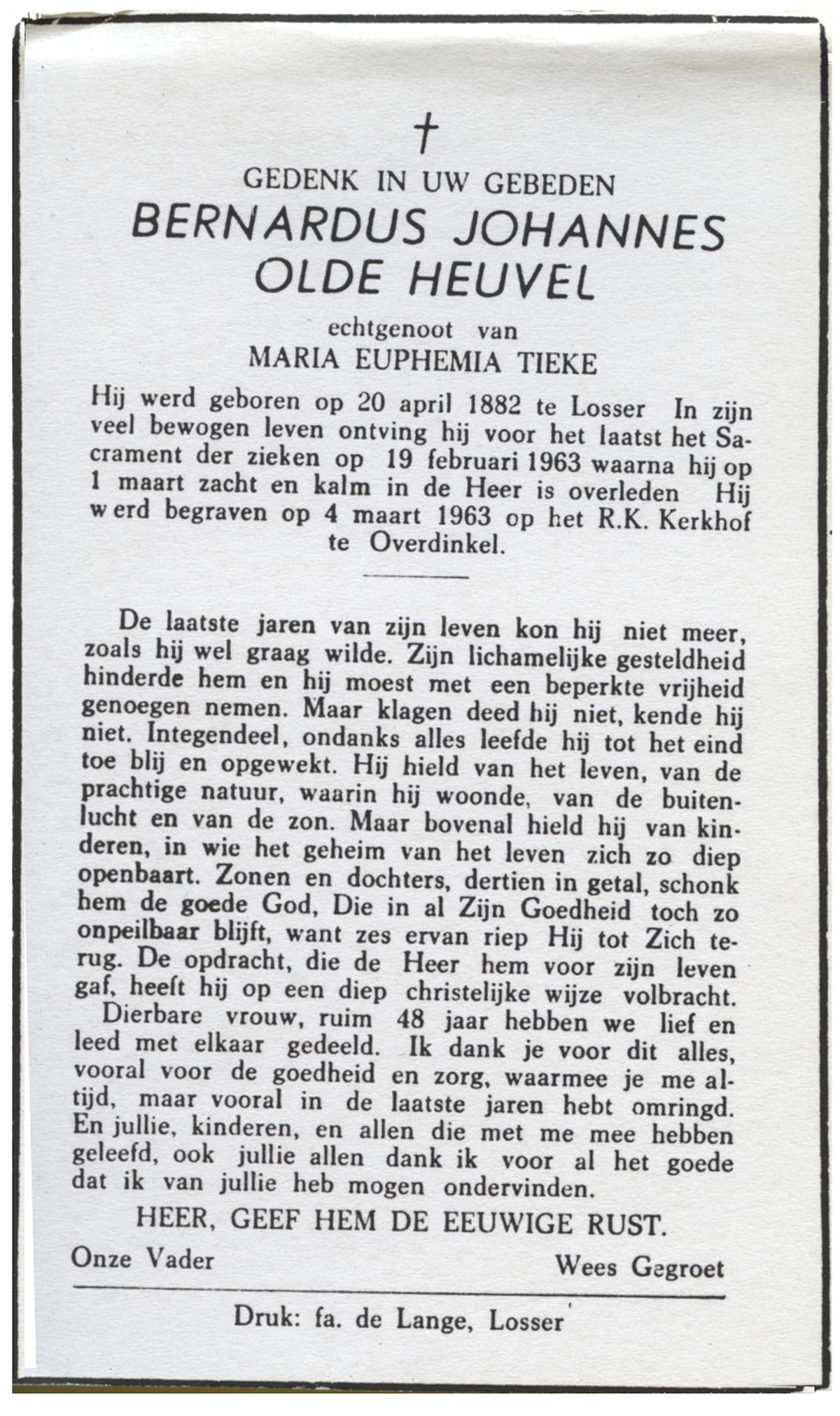 OLDE HEUVEL, Bernardus Johannes, geboren op 20-04-1882 te Losser, overleden op 1-3-1963 op 80-jarige leeftijd, begraven op 4-3-1963 te Overdinkel R.K.kerkhof.