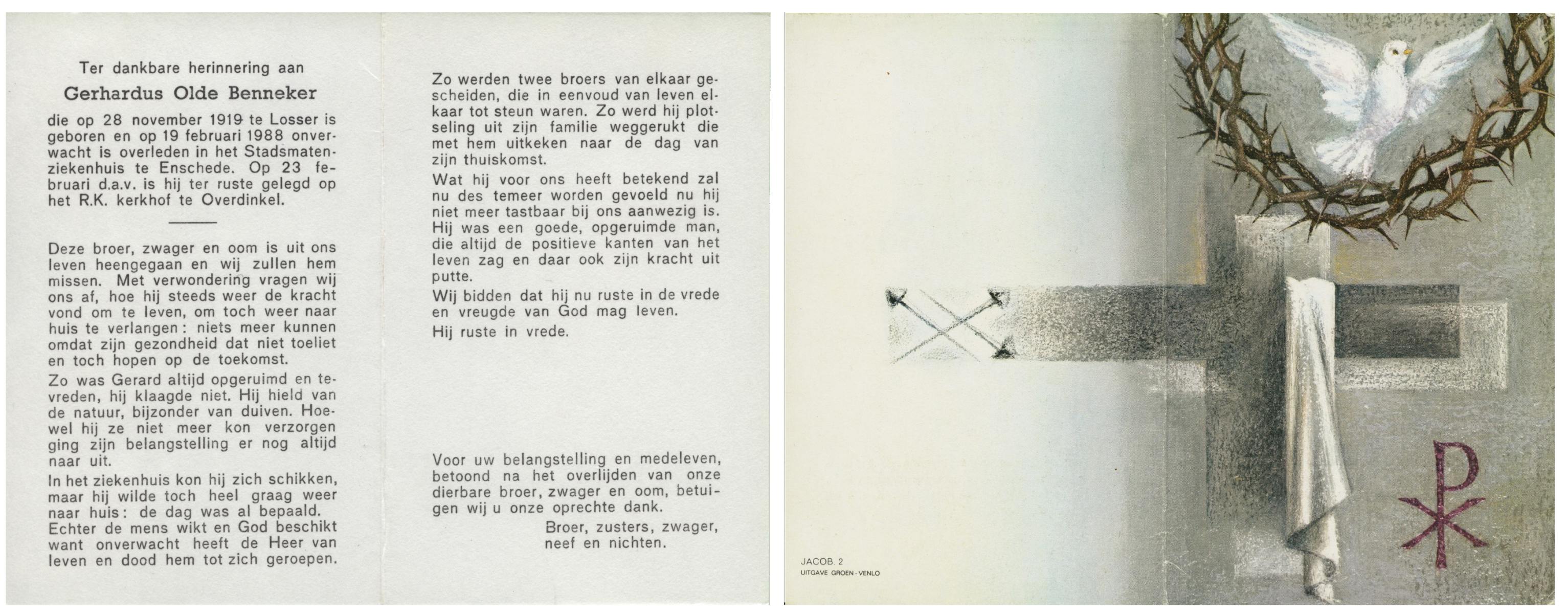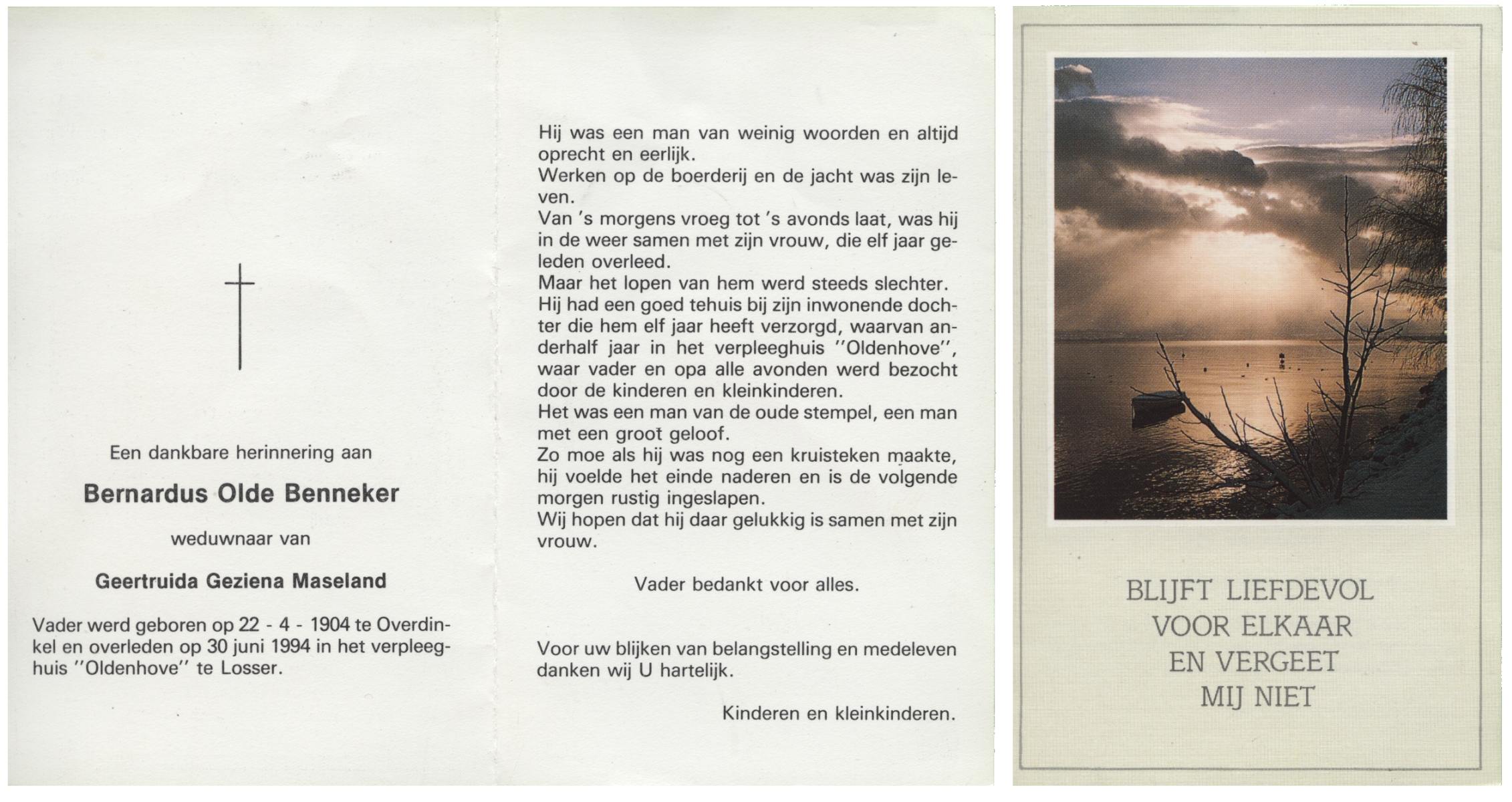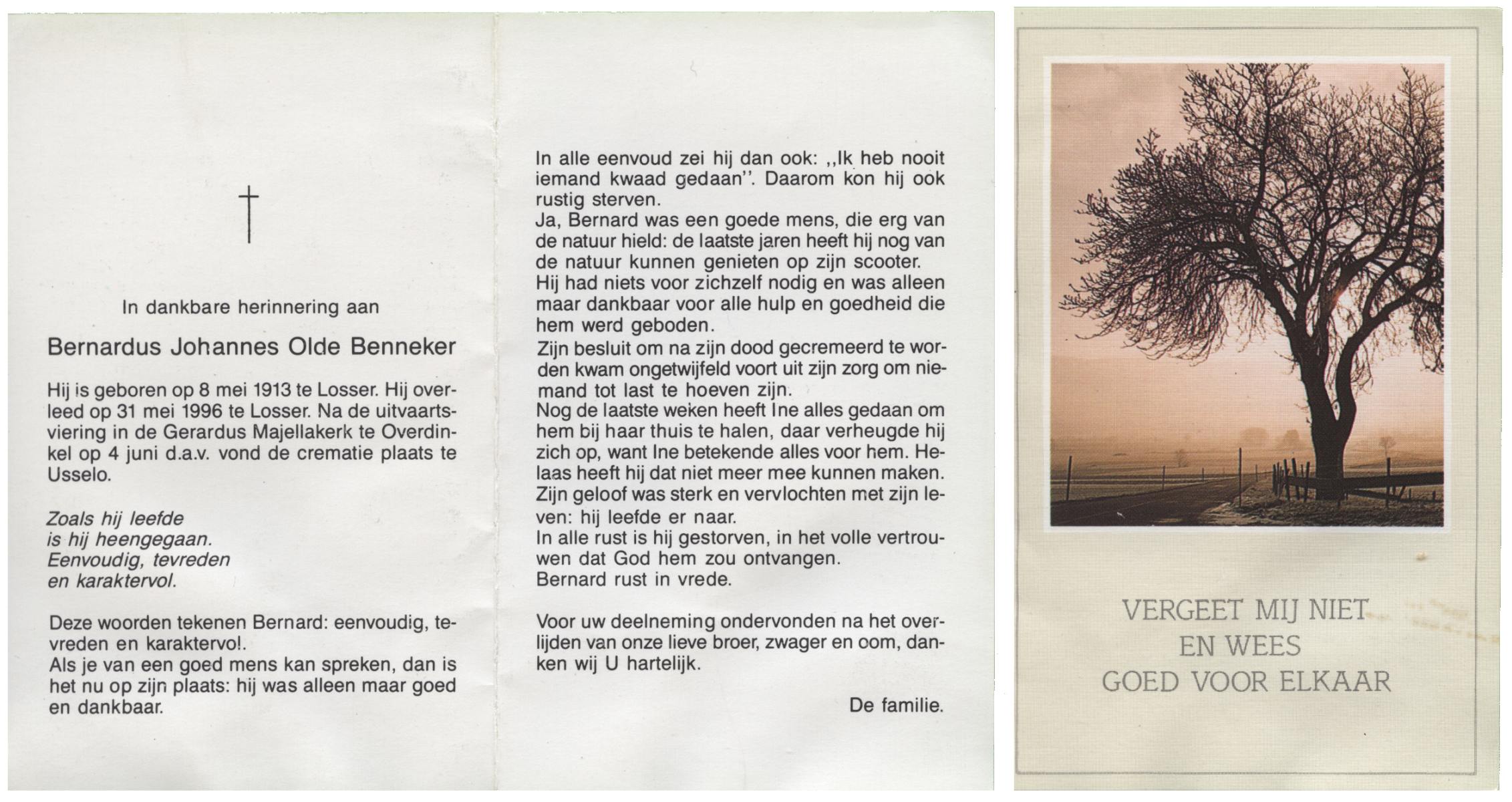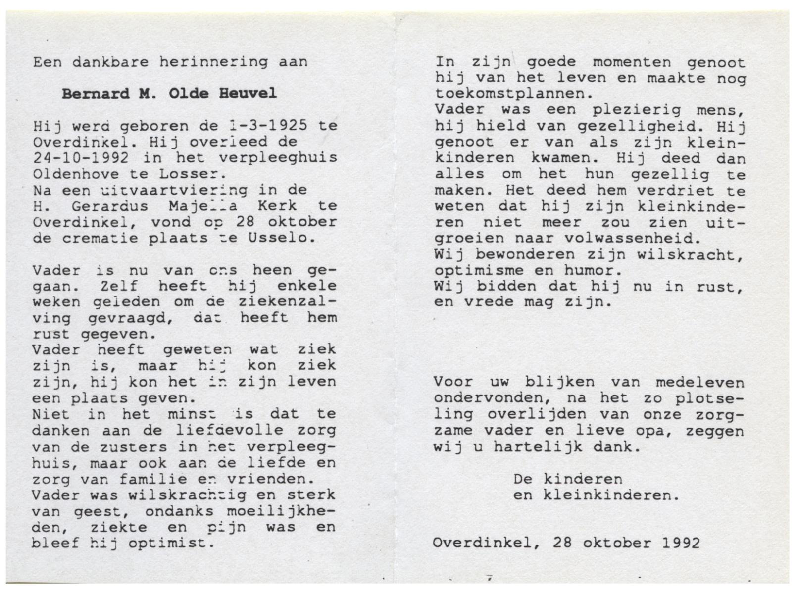 OLDE HEUVEL, Bernard M., geboren op 1-3-1925 te Overdinkel, overleden op 24-10-1992 te Losser op 67-jarige leeftijd, gecremeerd op 28-10-1992 te Usselo.