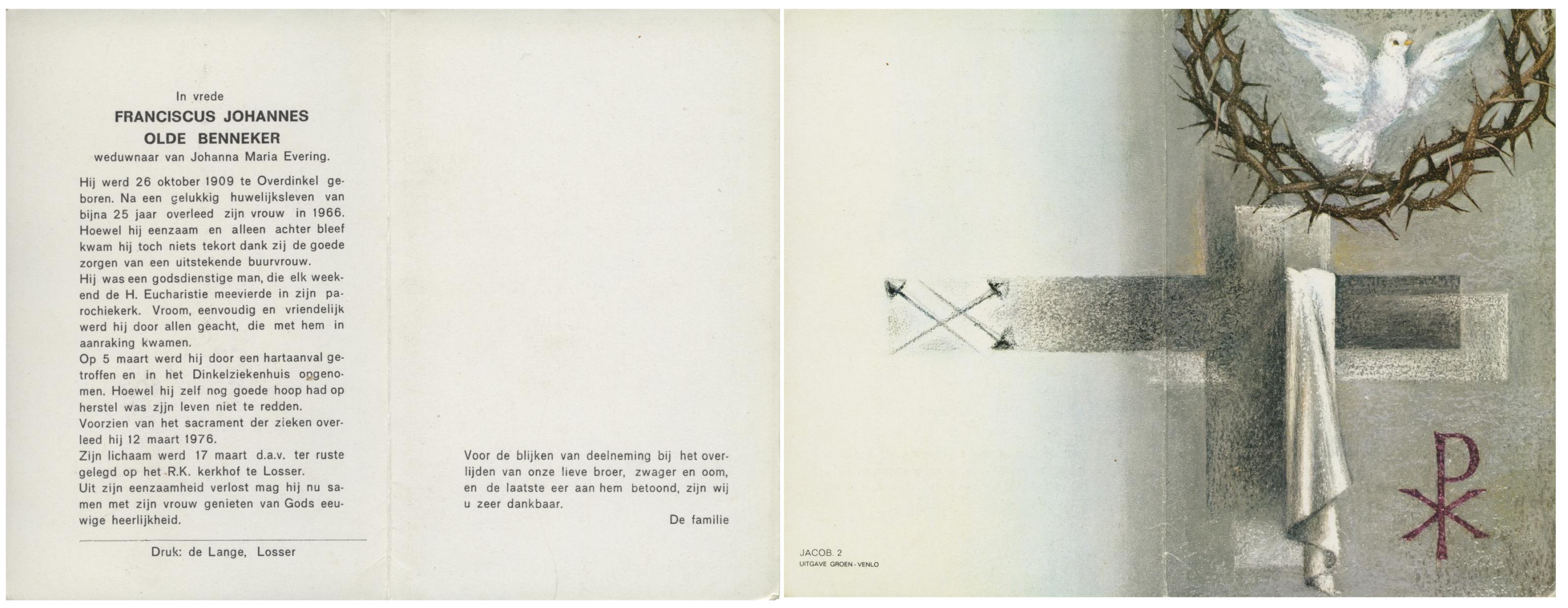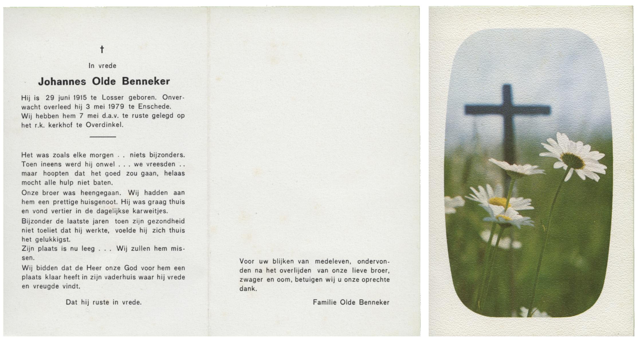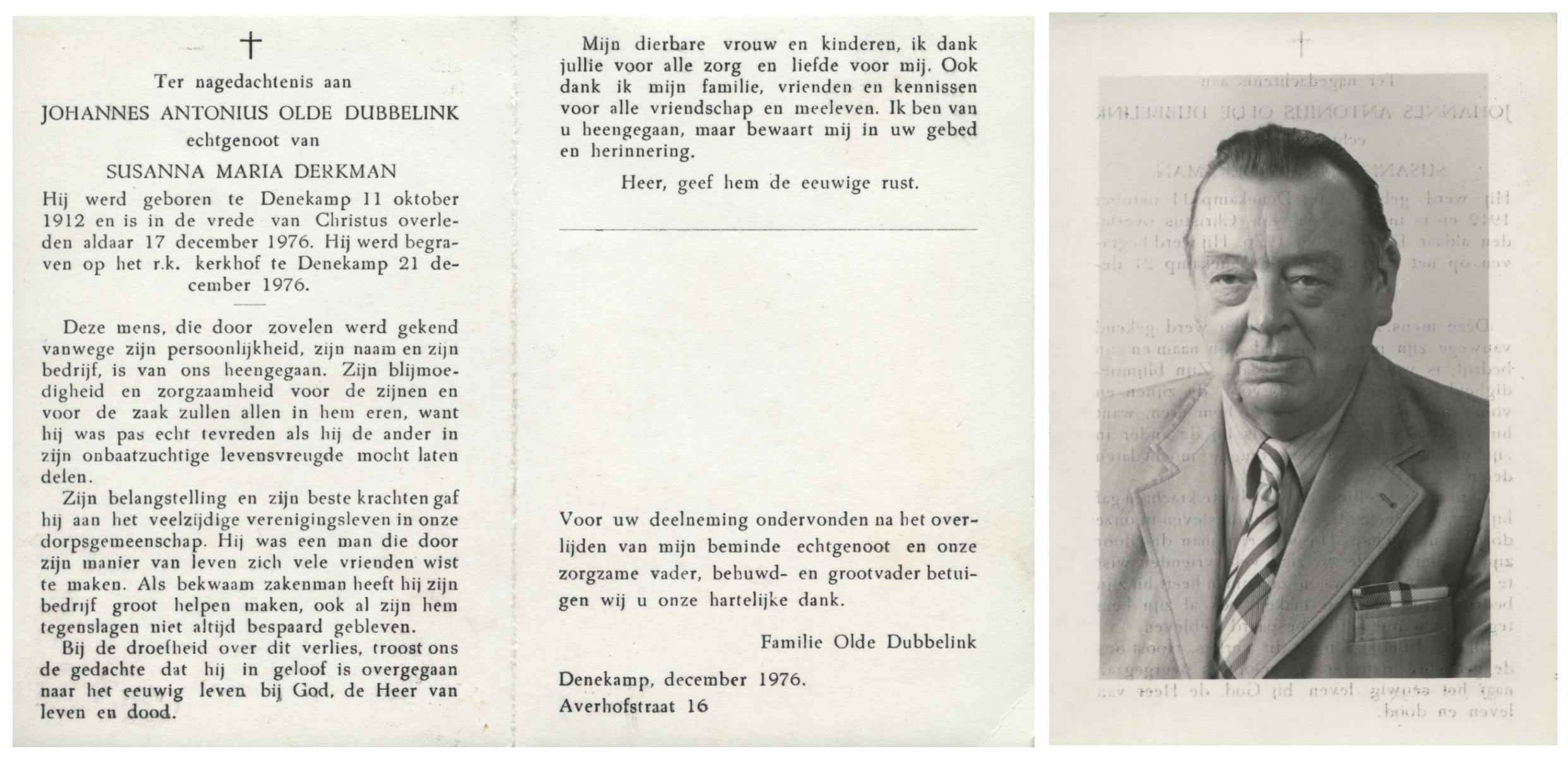 OLDE DUBBELINK, Johannes Antonius, geboren op 11-10-1912 te Denekamp, overleden op 17-12-1976 te Denekamp op 64-jarige leeftijd, begraven op 21-12-1976 te Denekamp.