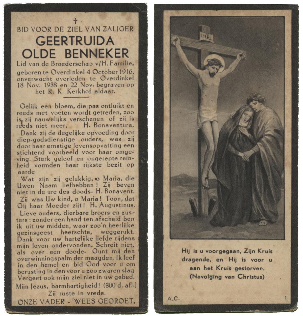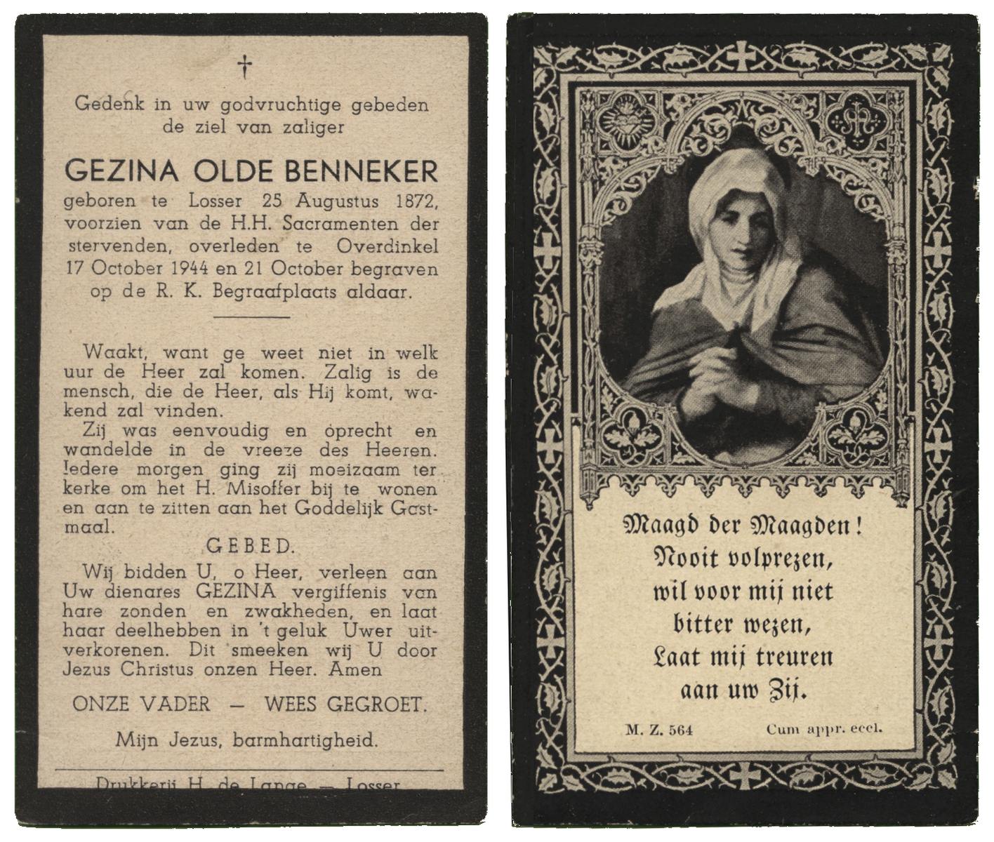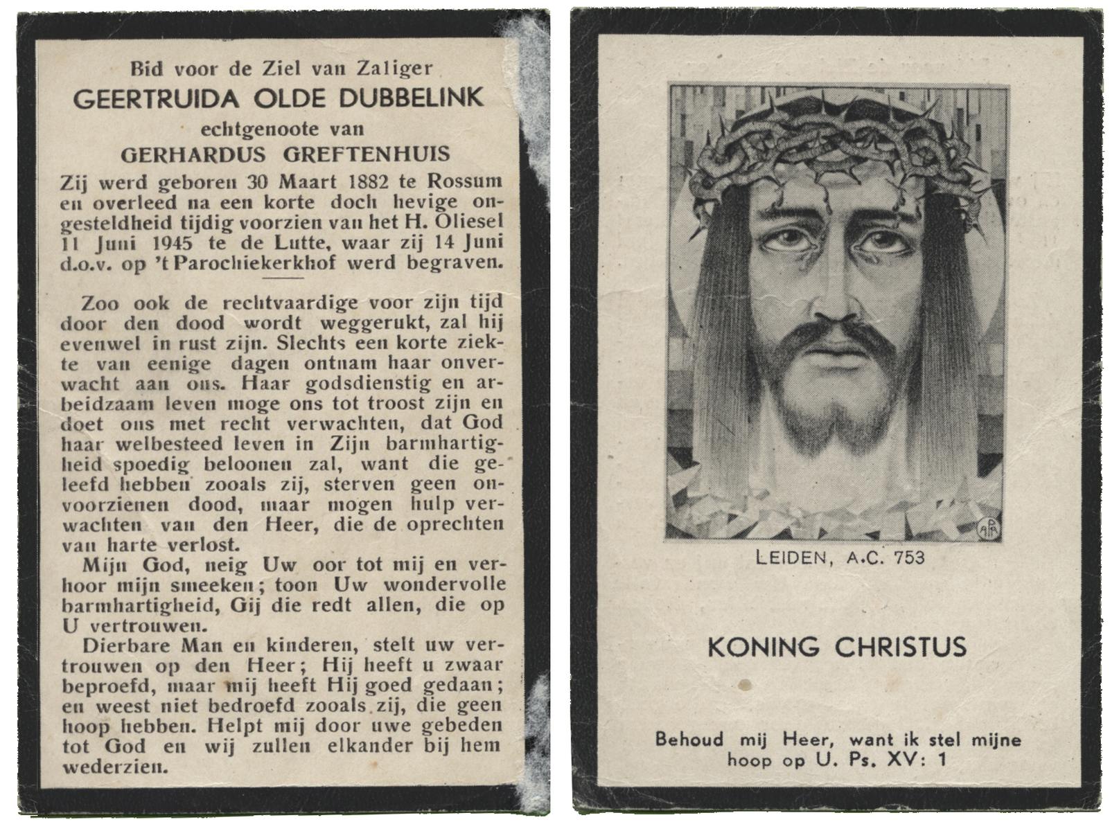 OLDE DUBBELINK, Geertruida, geboren op 30-03-1882 te Rossum, overleden op 11-6-1945 te De Lutte op 63-jarige leeftijd, begraven op 14-6-1945 te De Lutte.