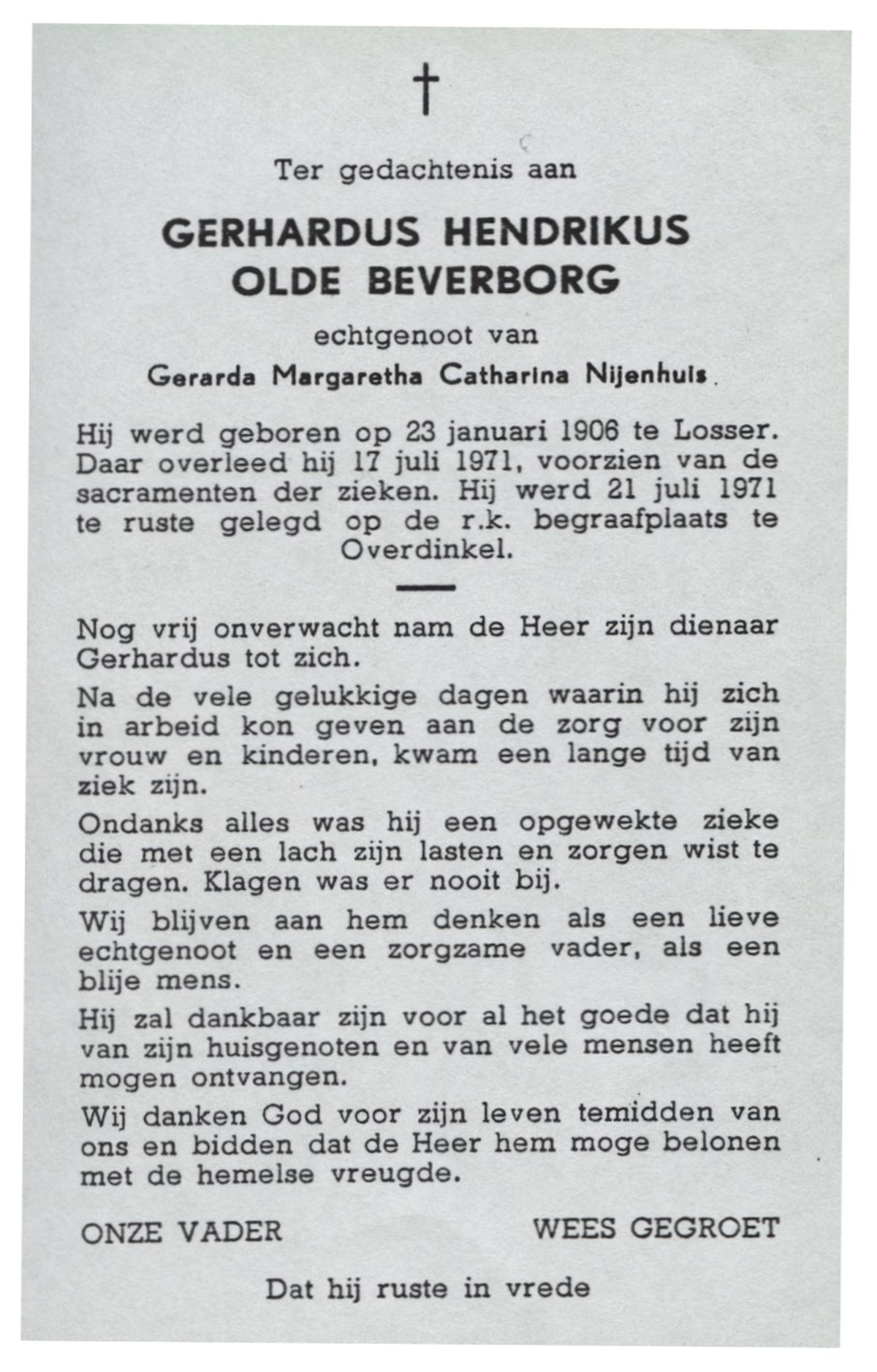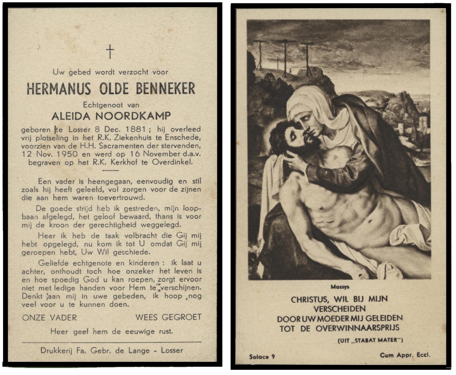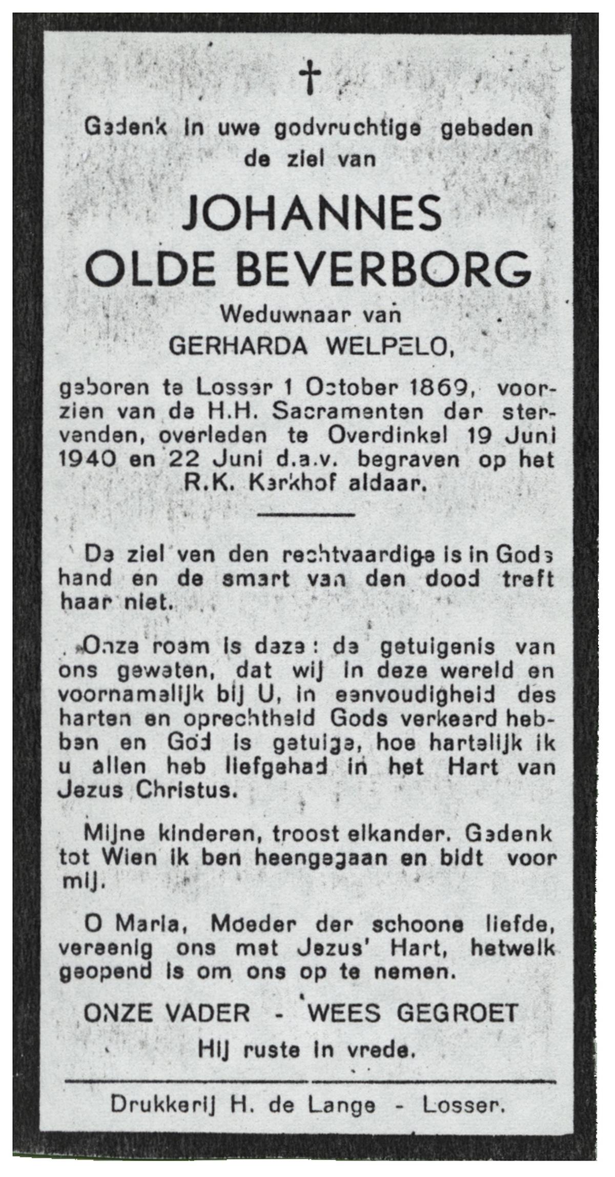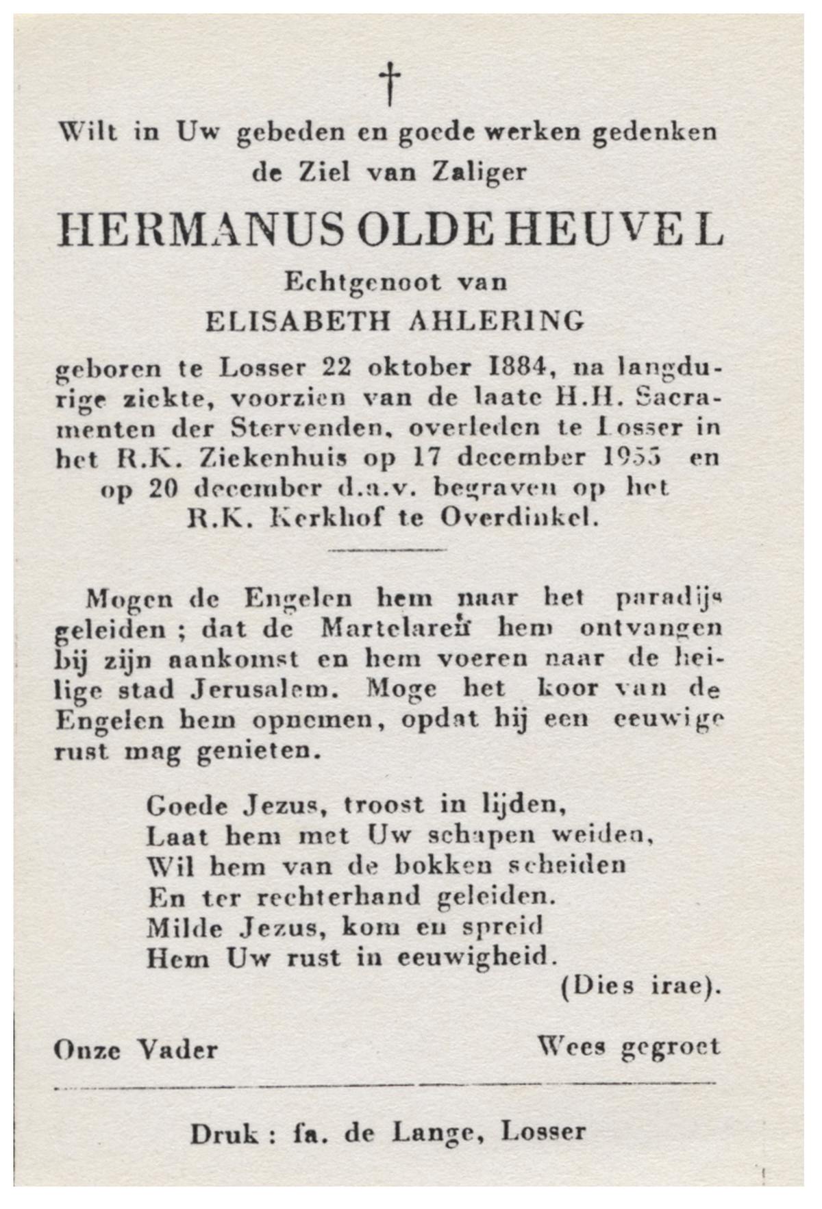 OLDE HEUVEL, Hermanus, geboren op 22-10-1884 te Losser, overleden op 17-12-1955 te Losser op 71-jarige leeftijd, begraven op 20-12-1955 te Overdinkel.