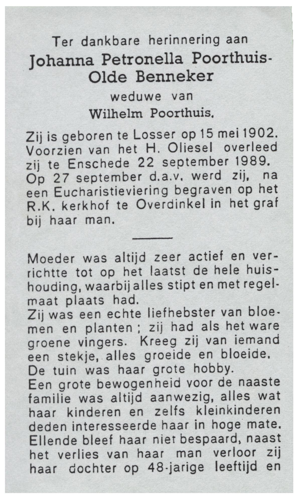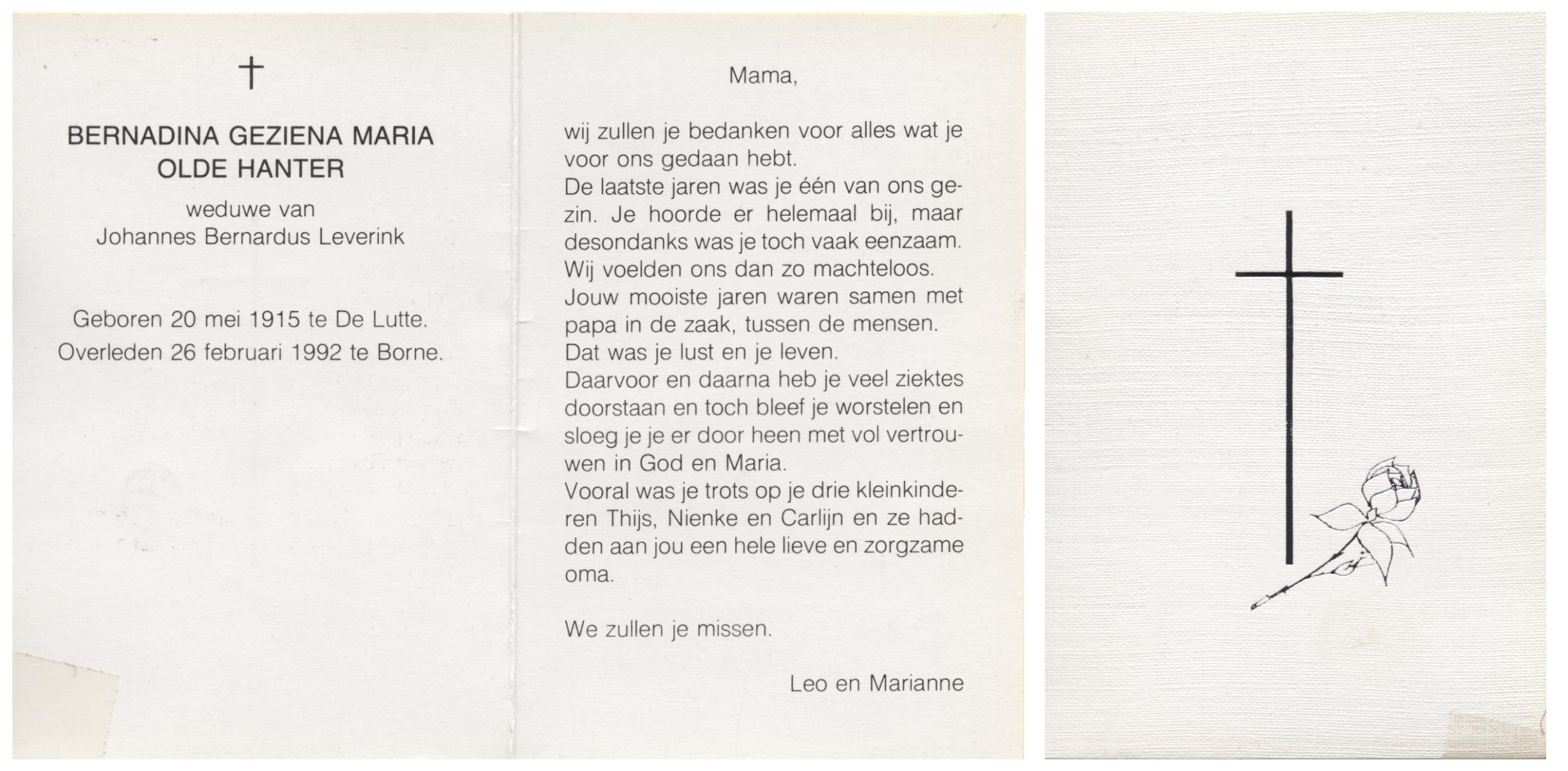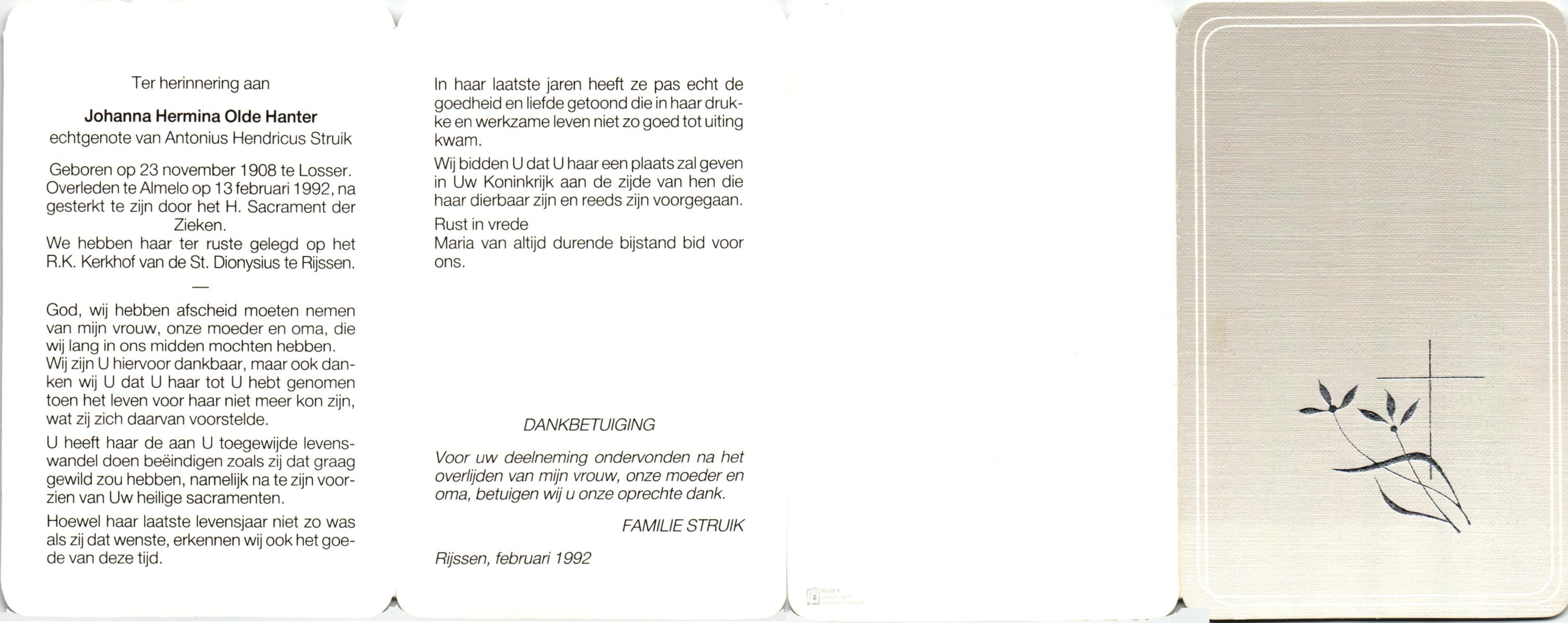 OLDE HANTER, Johanna Hermina, geboren op 23-11-1908 te Losser, overleden op 13-2-1992 te Almelo op 83-jarige leeftijd, begraven te Rijssen.