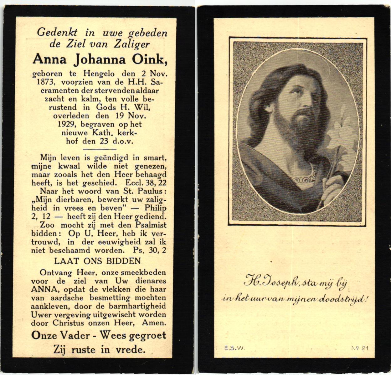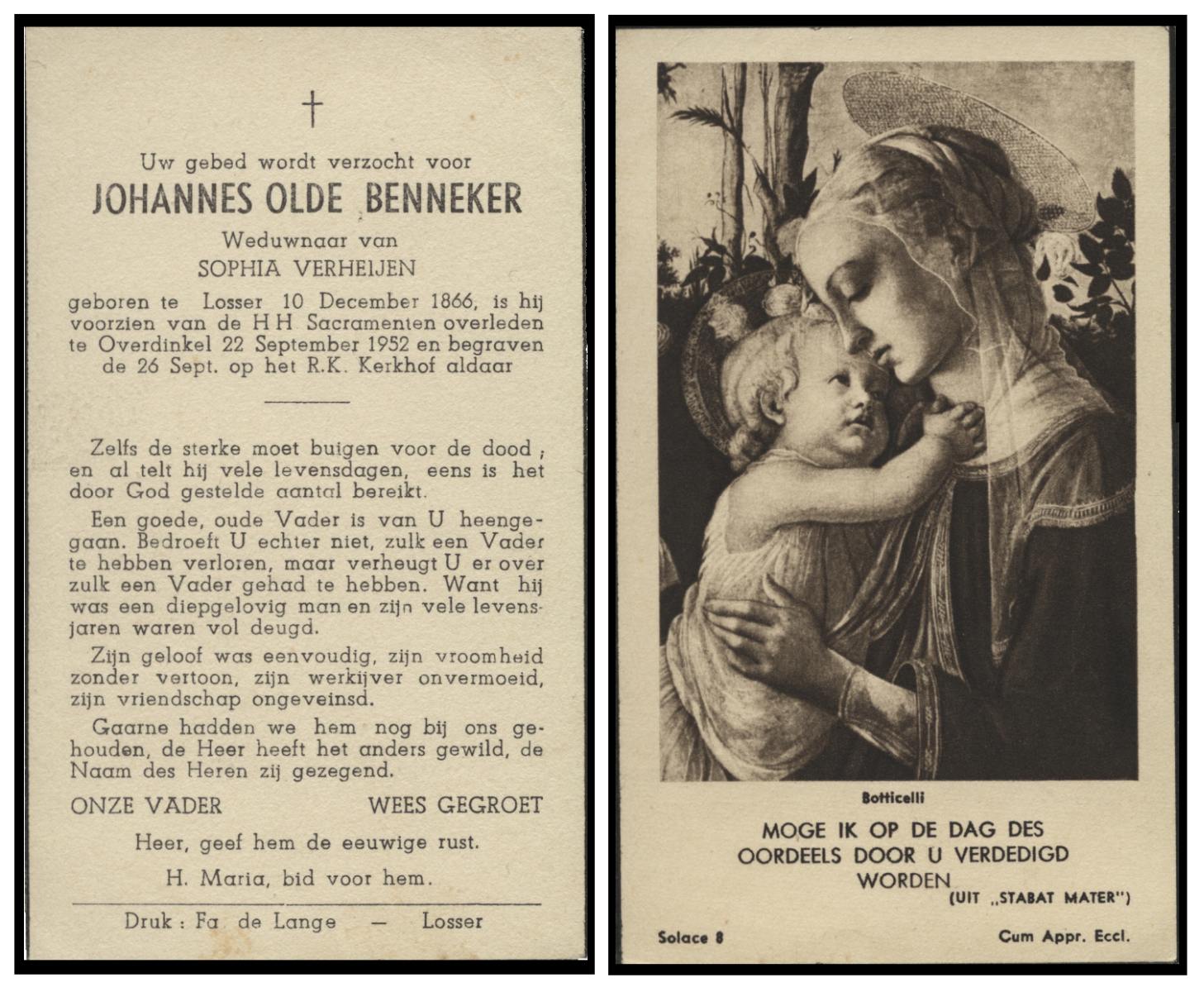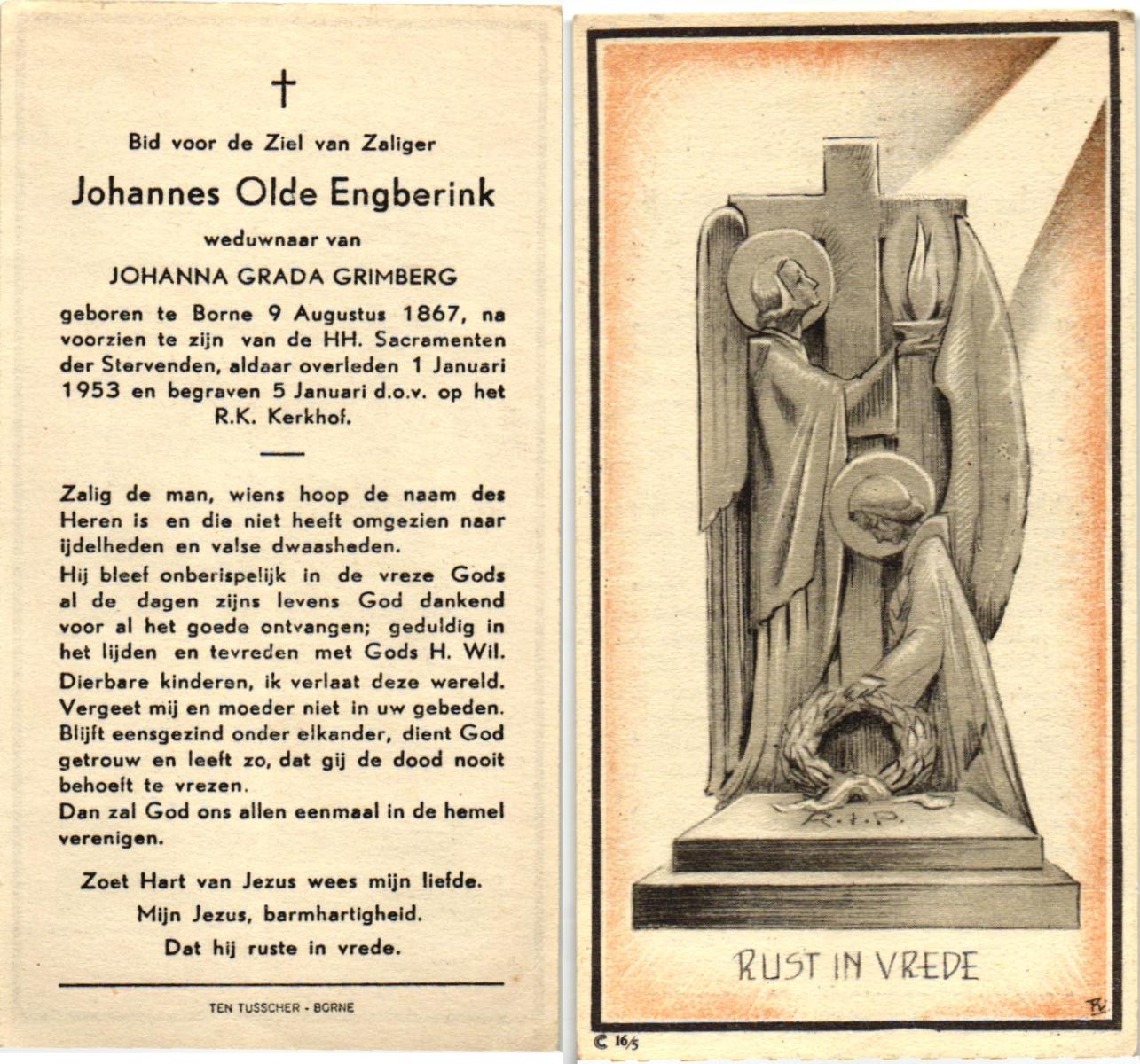 OLDE ENGBERINK, , Johannes, geboren op 09-08-1867 te Borne, overleden op 1-1-1953 te Borne op 85-jarige leeftijd, begraven op 5-1-1953 te Borne.