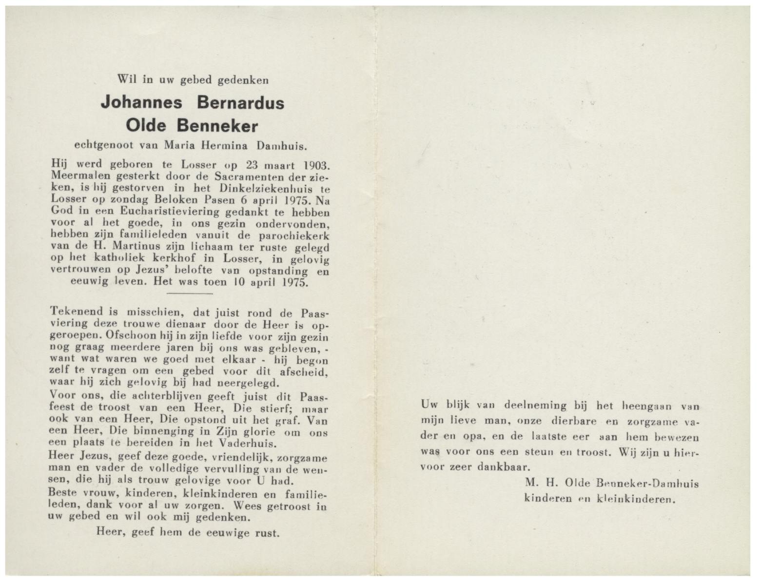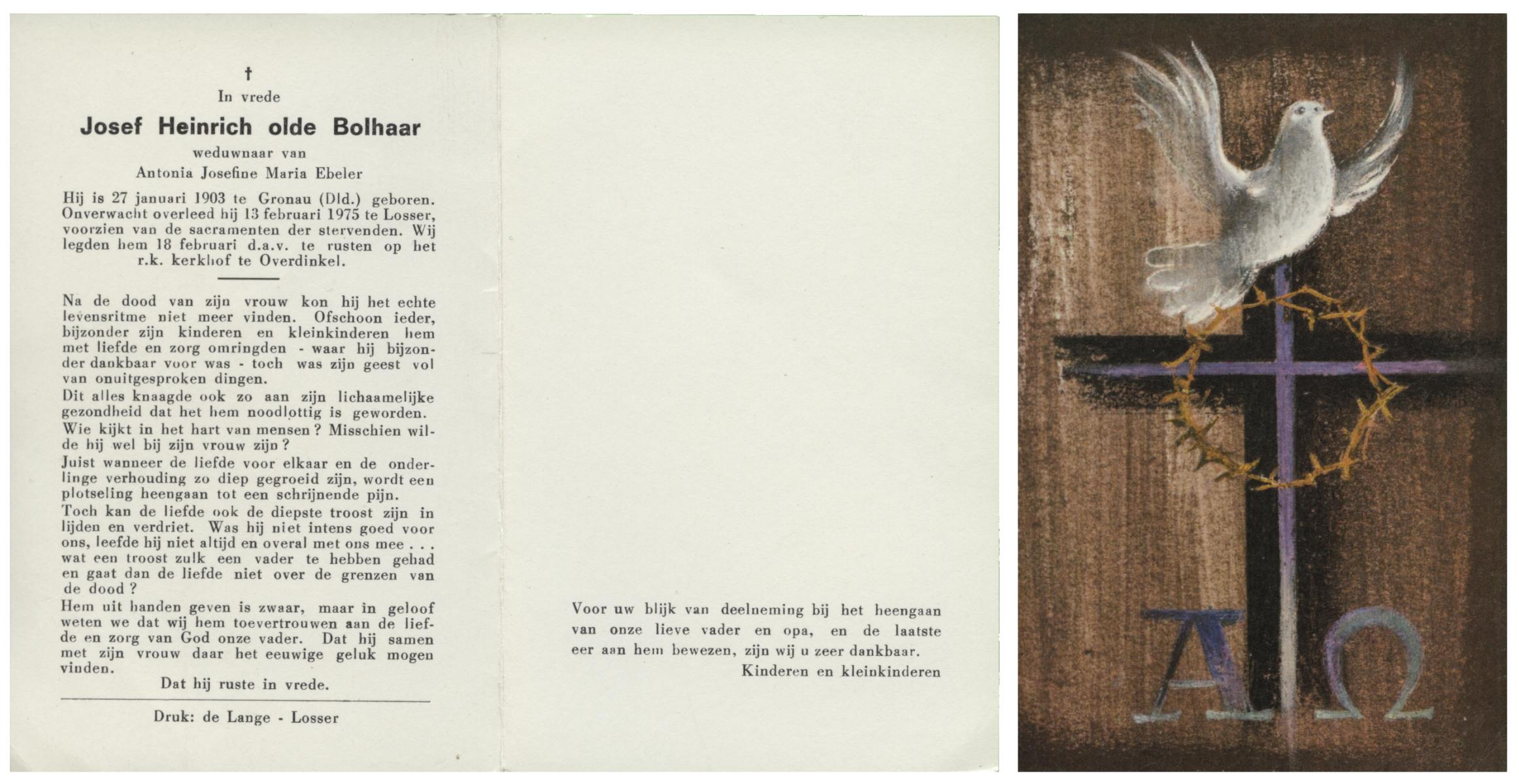 OLDE BOLHAAR, Josef Heinrich, geboren op 27-1-1903 te Gronau (Dld.), overleden op 13-2-1975 te Losser op 72-jarige leeftijd, begraven op 18-2-1975 te Overdinkel.