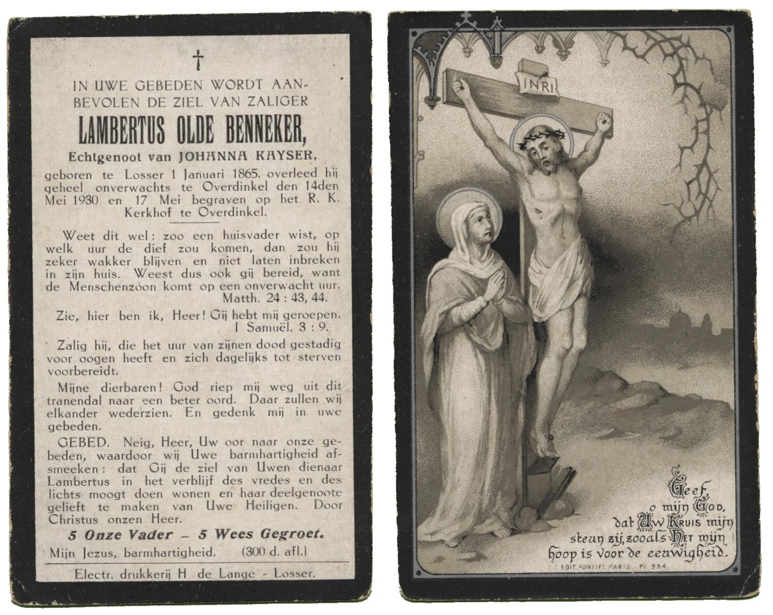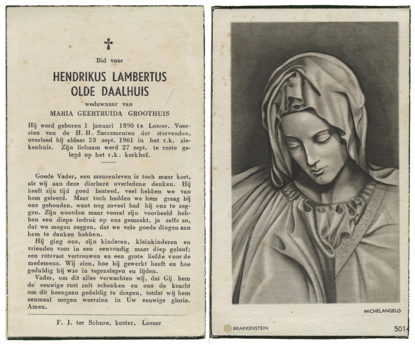 OLDE DAALHUIS, Hendrikus Lambertus, geboren op 01-01-1890 te Losser, overleden op 23-9-1961 te Losser op 71-jarige leeftijd, begraven op 27-9-1961 te Losser.
