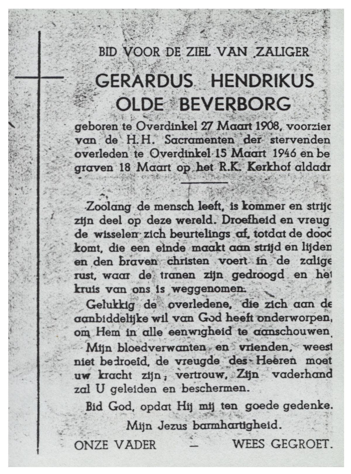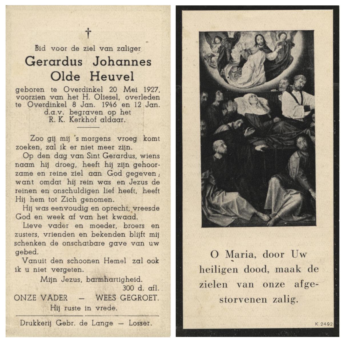 OLDE HEUVEL, Gerardus Johannes, geboren op 20-5-1927 te Overdinkel, overleden op 8-1-1946 te Overdinkel op 18-jarige leeftijd, begraven op 12-1-1946 te Overdinkel.