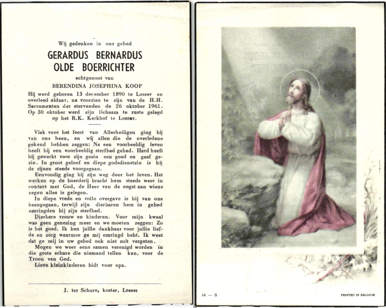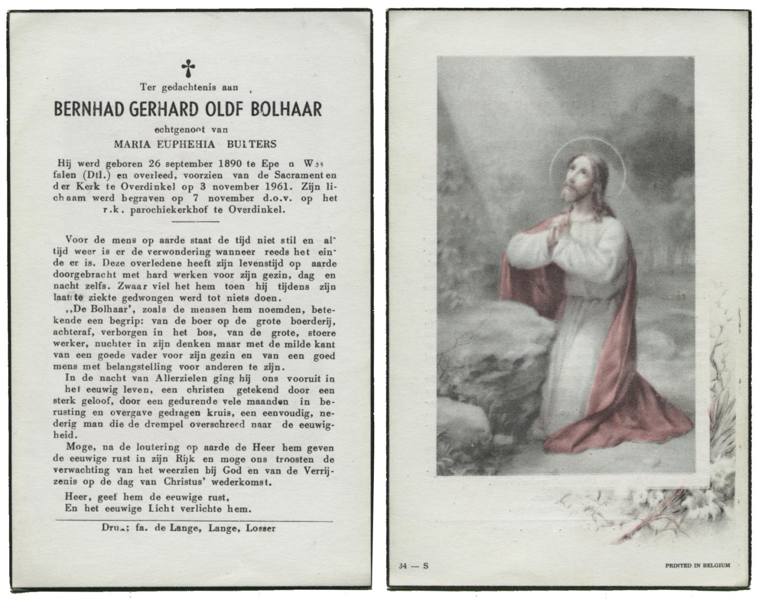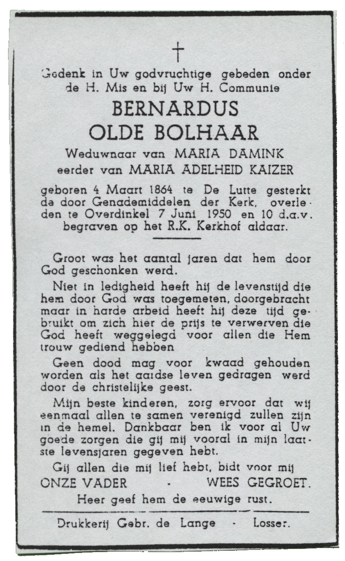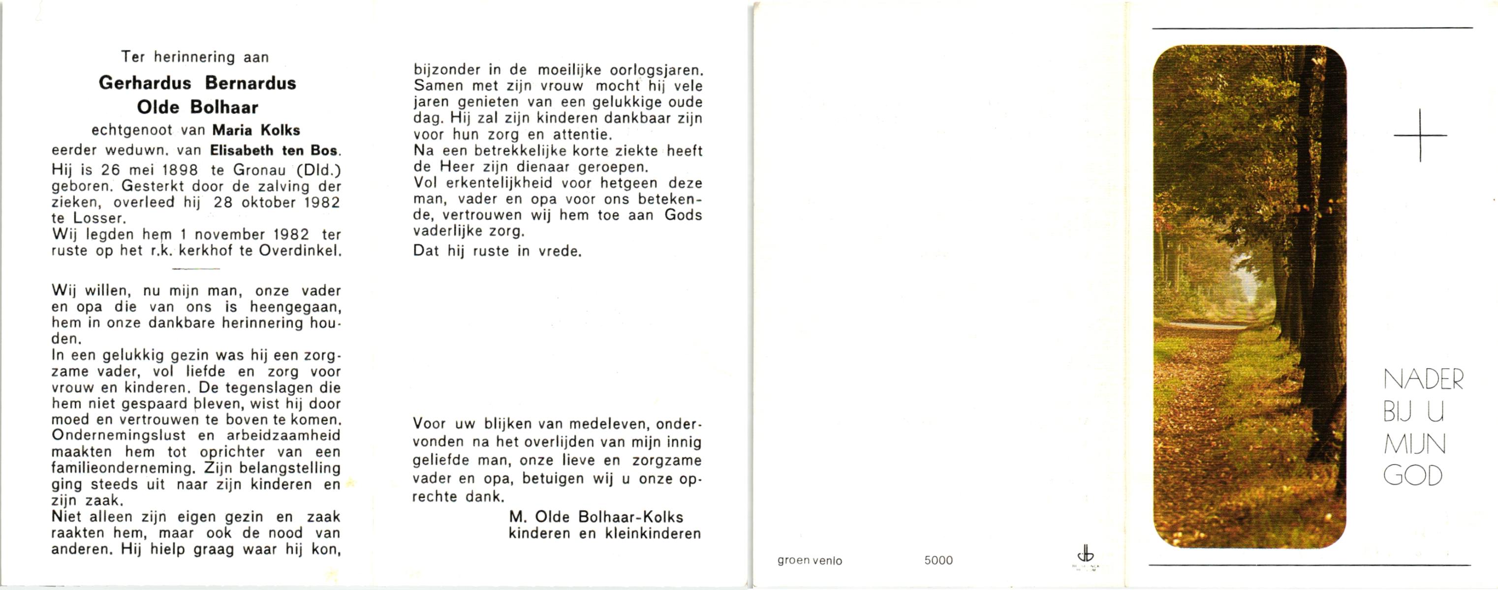 OLDE BOLHAAR, , Gerhardus Bernardus, geboren op 26-05-1898 te Gronau, Dld, overleden op 28-10-1982 te Losser op 84-jarige leeftijd, begraven op 1-11-1982 te Overdinkel.