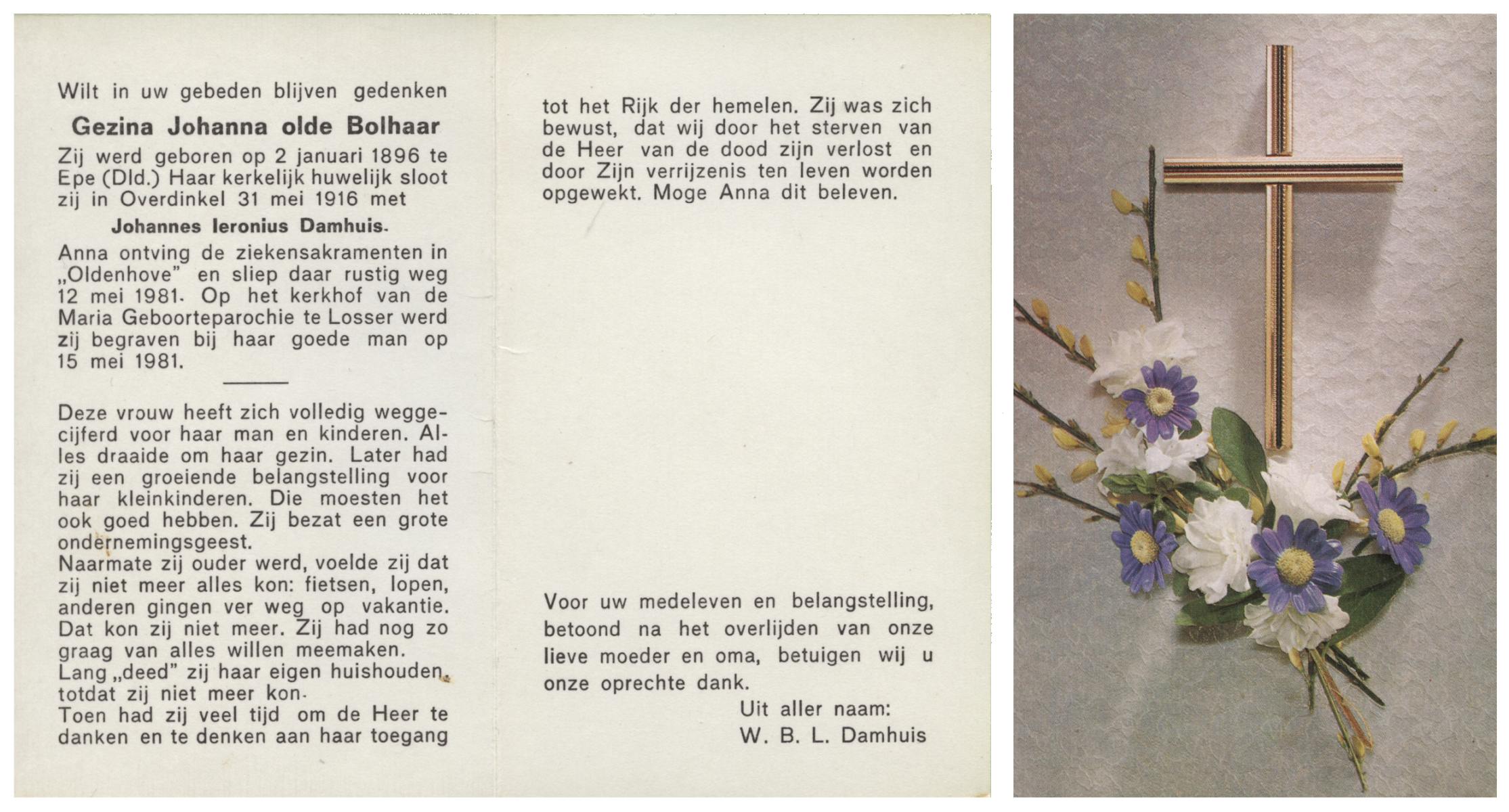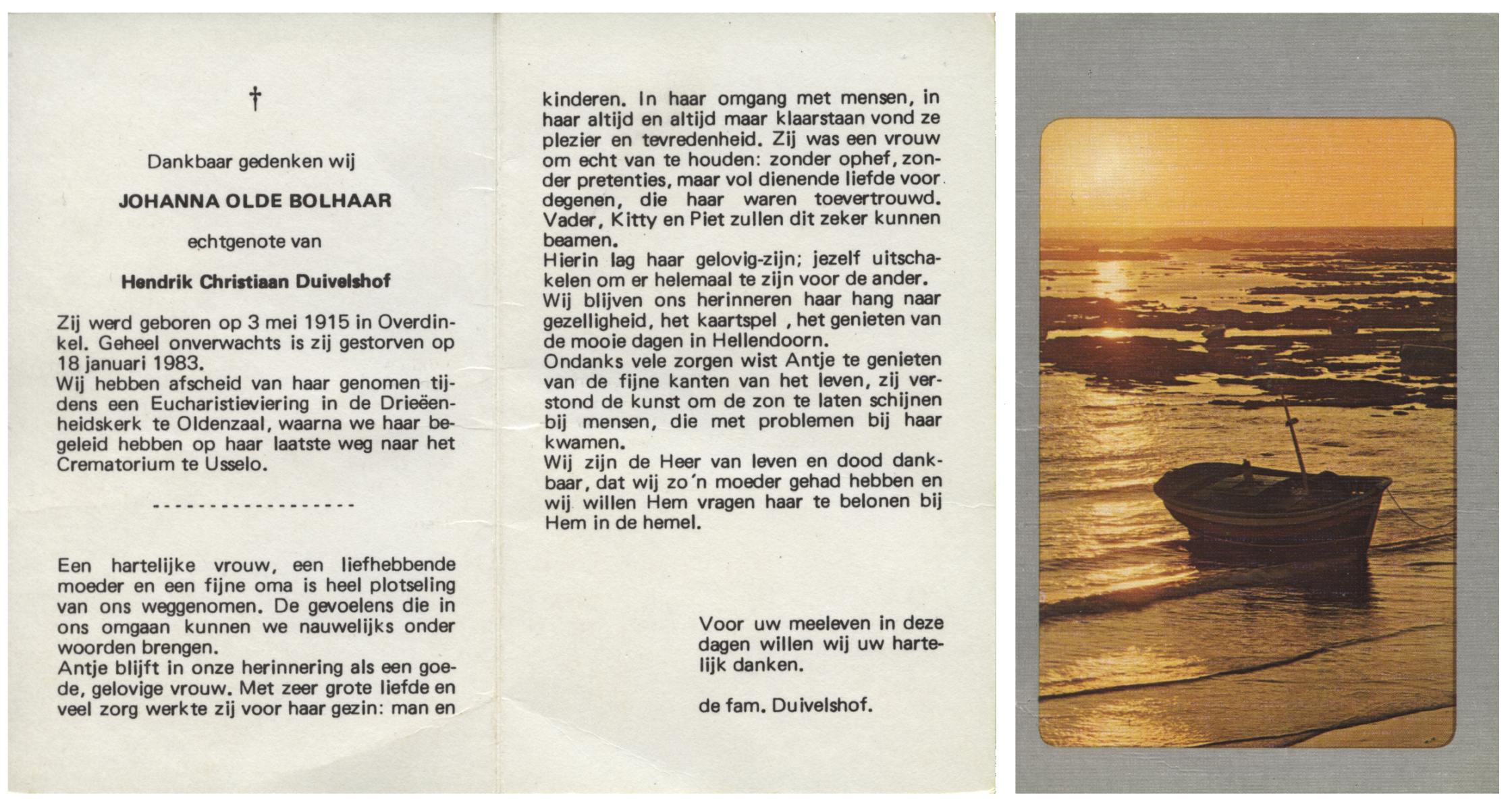 OLDE BOLHAAR, Johanna, geboren op 3-5-1915 te Overdinkel, overleden op 18-1-1983 op 67-jarige leeftijd, gecremeerd te Usselo.