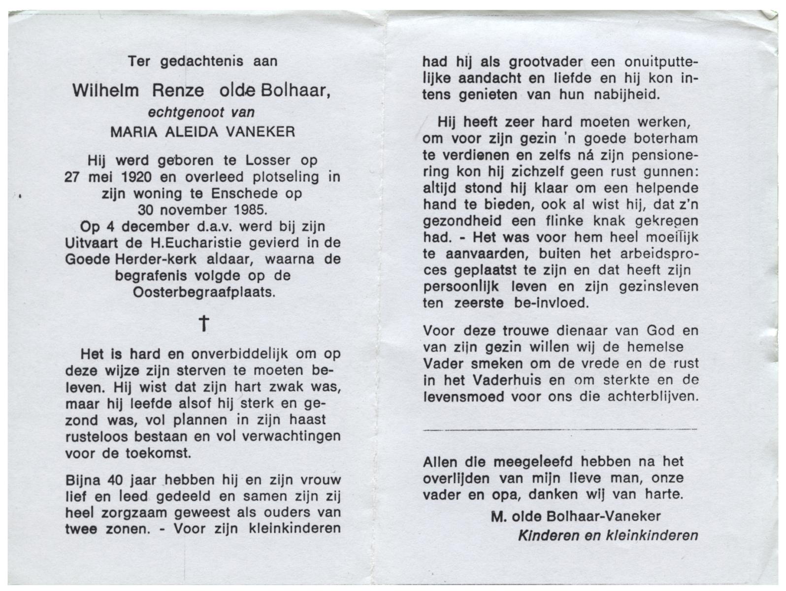 OLDE BOLHAAR, Wilhelm Renze, geboren op 27-5-1920 te Losser, overleden op 30-11-1985 te Enschede op 65-jarige leeftijd, begraven op 4-12-1985 te Enschede.