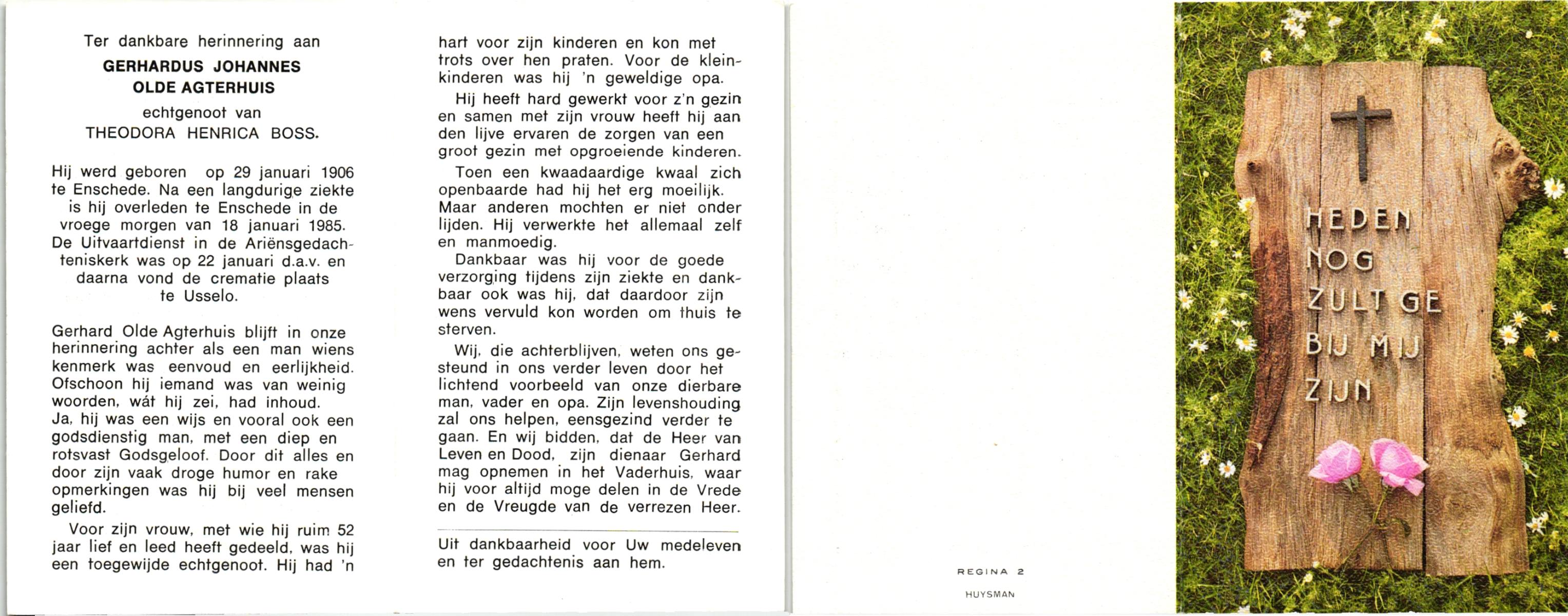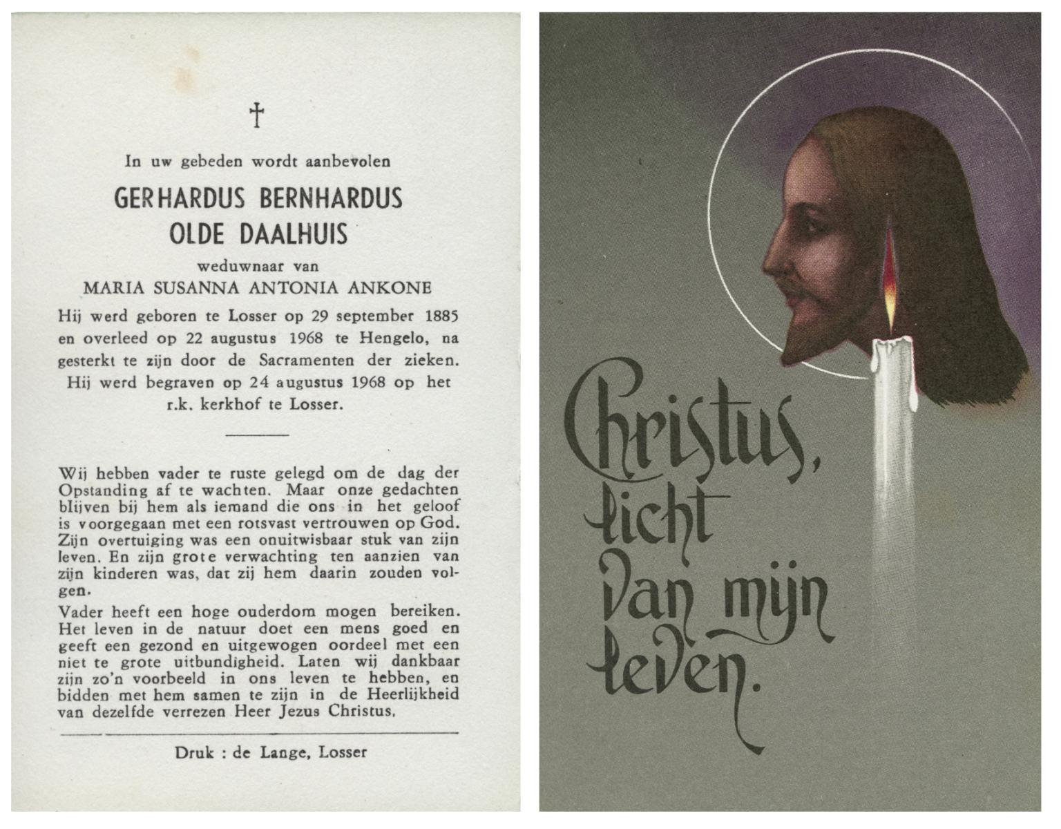 OLDE DAALHUIS, Gerhardus Bernardus, geboren op 29-09-1885 te Losser, overleden op 22-8-1968 te Hengelo (Ov.) op 82-jarige leeftijd, begraven op 24-8-1968 te Hengelo (Ov.).