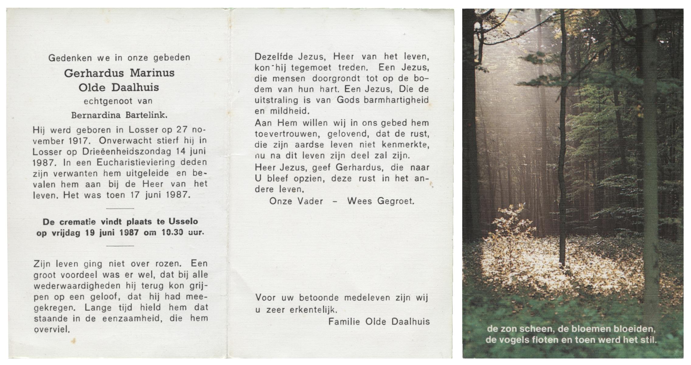 OLDE DAALHUIS, Gerhardus Marinus, geboren op 27-11-1917 te Losser, overleden op 14-6-1987 te Losser op 69-jarige leeftijd, gecremeerd op 17-6-1987 te Usselo.