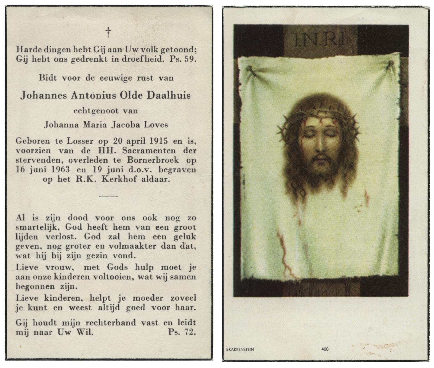 OLDE DAALHUIS, Johannes Antonius, geboren op 20-4-1915 te Losser, overleden op 16-6-1963 te Bornerbroek op 49-jarige leeftijd, begraven op 19-6-1963 te Bornerbroek.