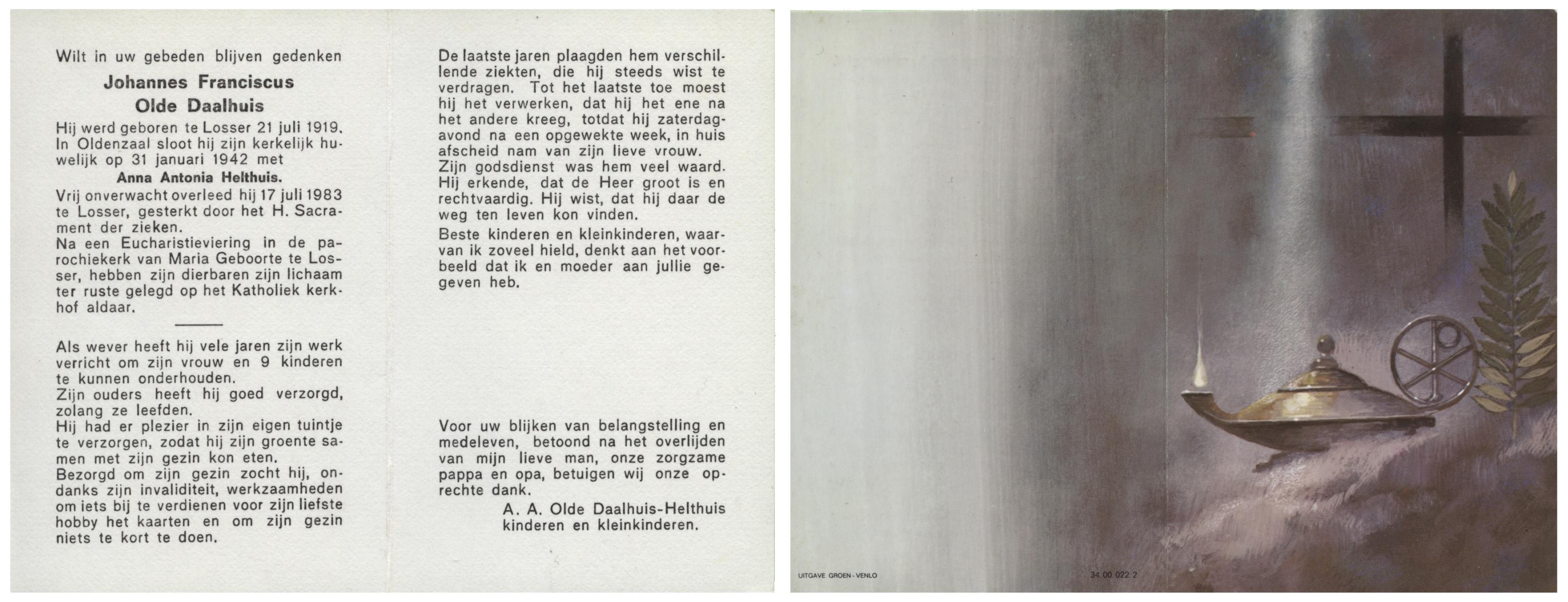 OLDE DAALHUIS, Johannes Franciscus, geboren op 21-7-1919 te Losser, overleden op 17-7-1983 te Losser op 63-jarige leeftijd, begraven te Losser.