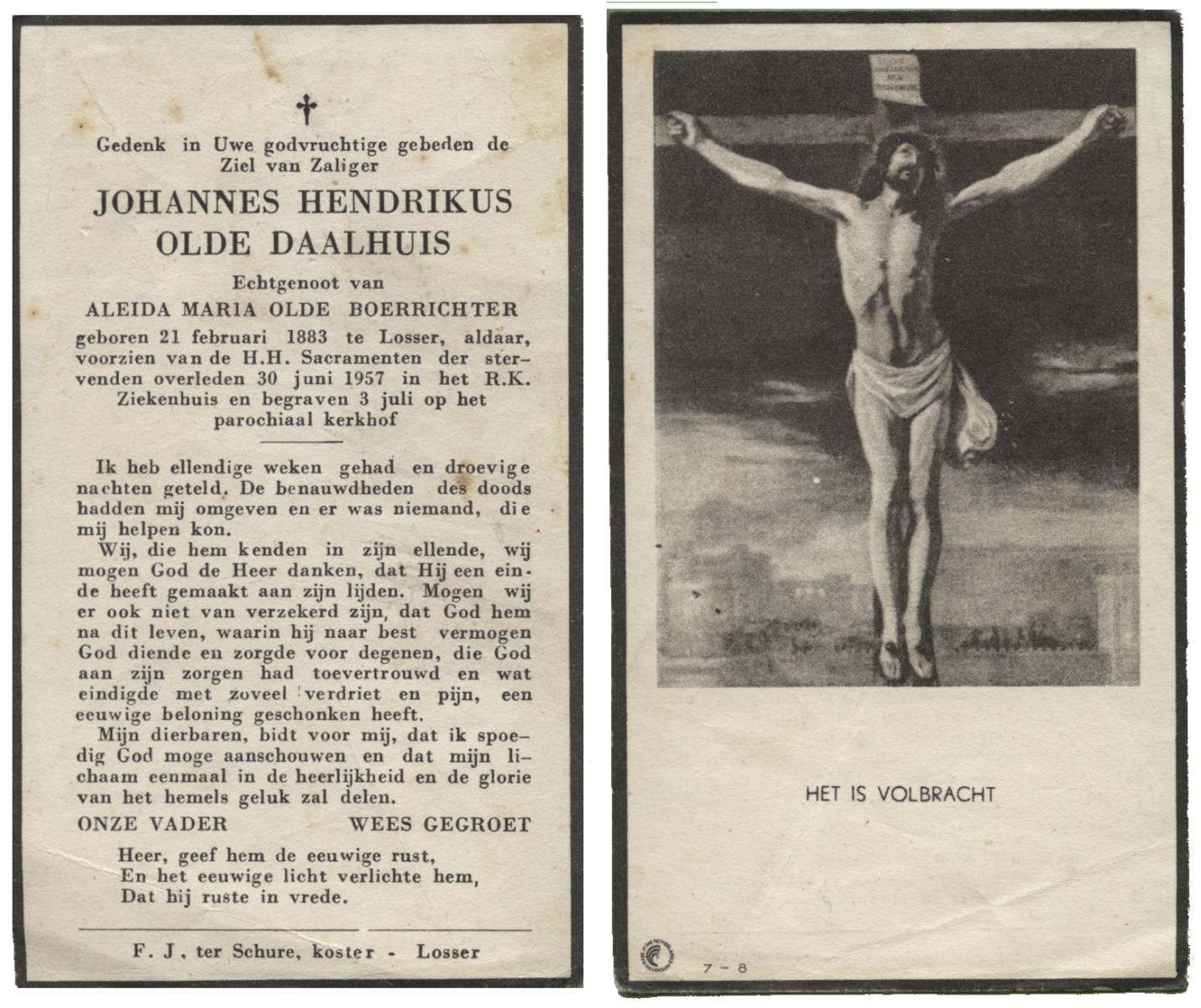 OLDE DAALHUIS, Johannes Hendrikus, geboren op 21-02-1883 te Losser, overleden op 30-6-1957 te Losser op 74-jarige leeftijd, begraven op 3-7-1957 te Losser.