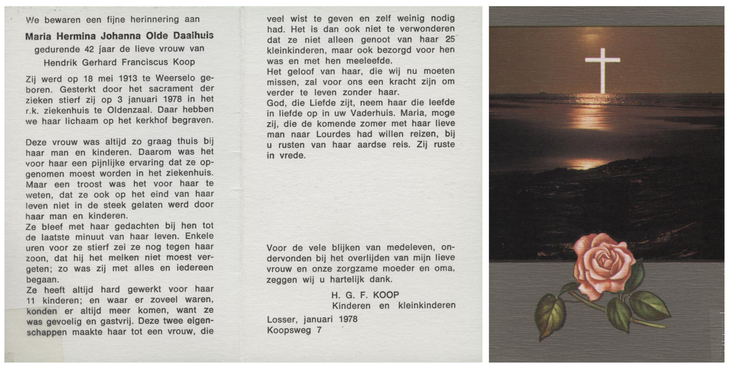 OLDE DAALHUIS, Maria Hermina Johanna, geboren op 18-5-1913 te Weerselo, overleden op 3-1-1978 te Oldenzaal op 64-jarige leeftijd, begraven te Oldenzaal.