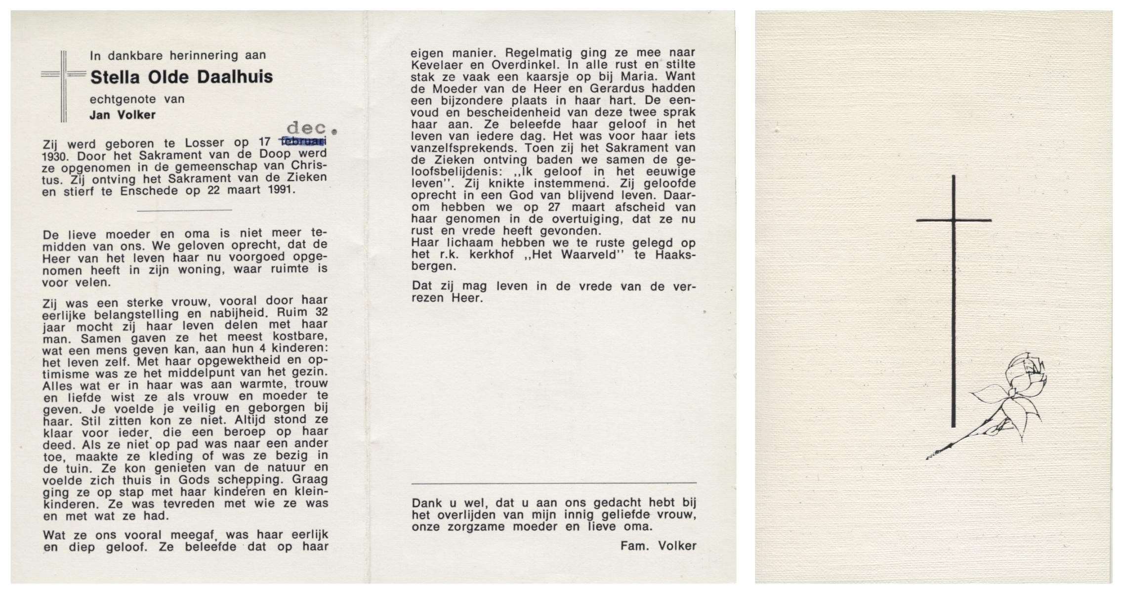 OLDE DAALHUIS, Stella, geboren op 17-12-1930 te Losser, overleden op 22-3-1991 te Enschede op 60-jarige leeftijd, begraven op 27-3-1991 te Haaksbergen.