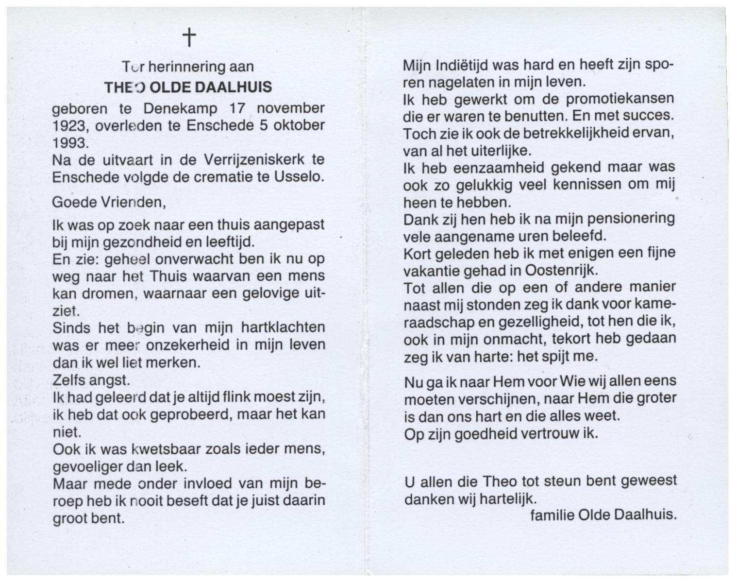 OLDE DAALHUIS, Theo, geboren op 17-11-1923 te Denekamp, overleden op 5-10-1993 te Enschede op 69-jarige leeftijd, gecremeerd te Usselo.