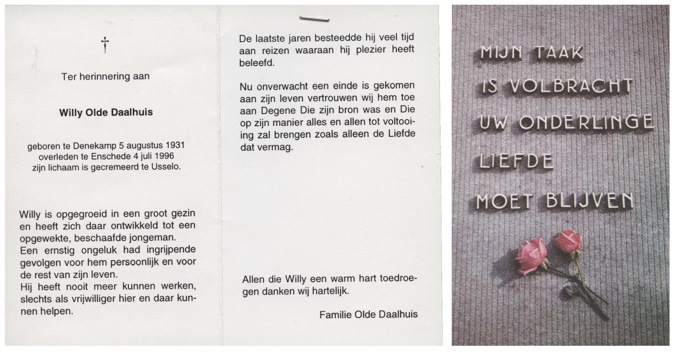 OLDE DAALHUIS, Willy, geboren op 5-8-1931 te Denekamp, overleden op 4-7-1996 te Enschede op 64-jarige leeftijd, gecremeerd te Usselo.