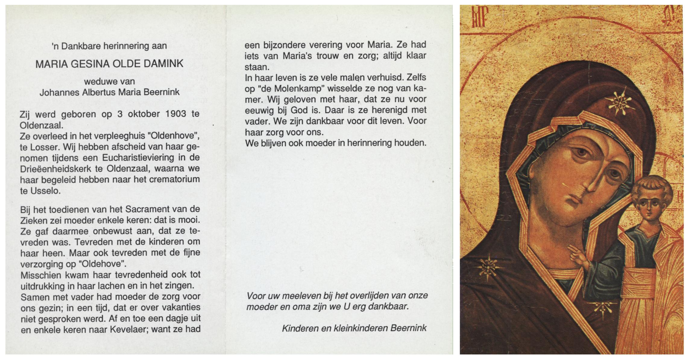 OLDE DAMINK, Maria Gesina, geboren op 3-10-1903 te Oldenzaal, overleden te Losser, gecremeerd te Usselo.