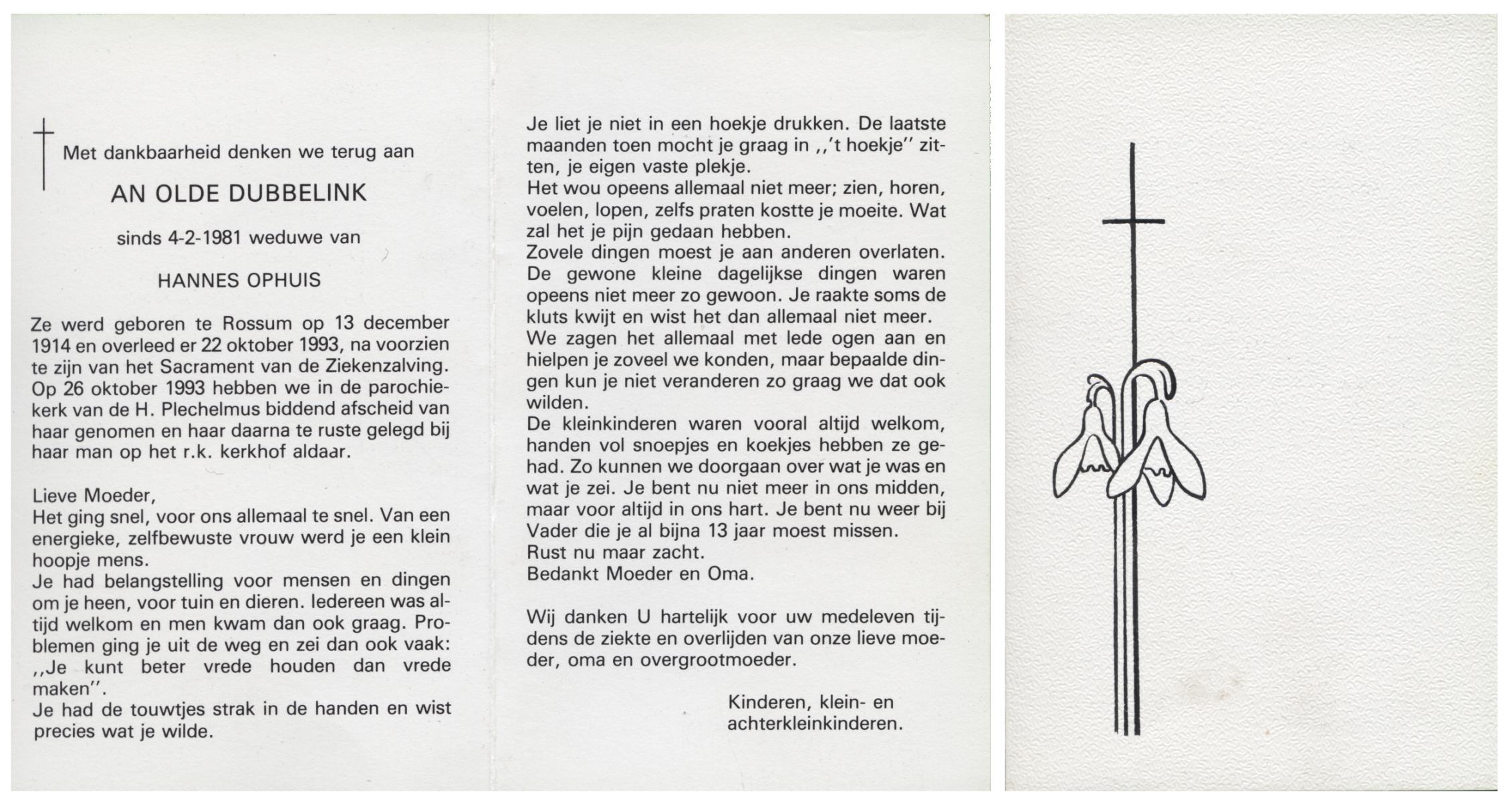 OLDE DUBBELINK, An, geboren op 13-12-1914 te Rossum, overleden op 22-10-1993 te Rossum op 78-jarige leeftijd, begraven op 26-10-1993 te Rossum.
