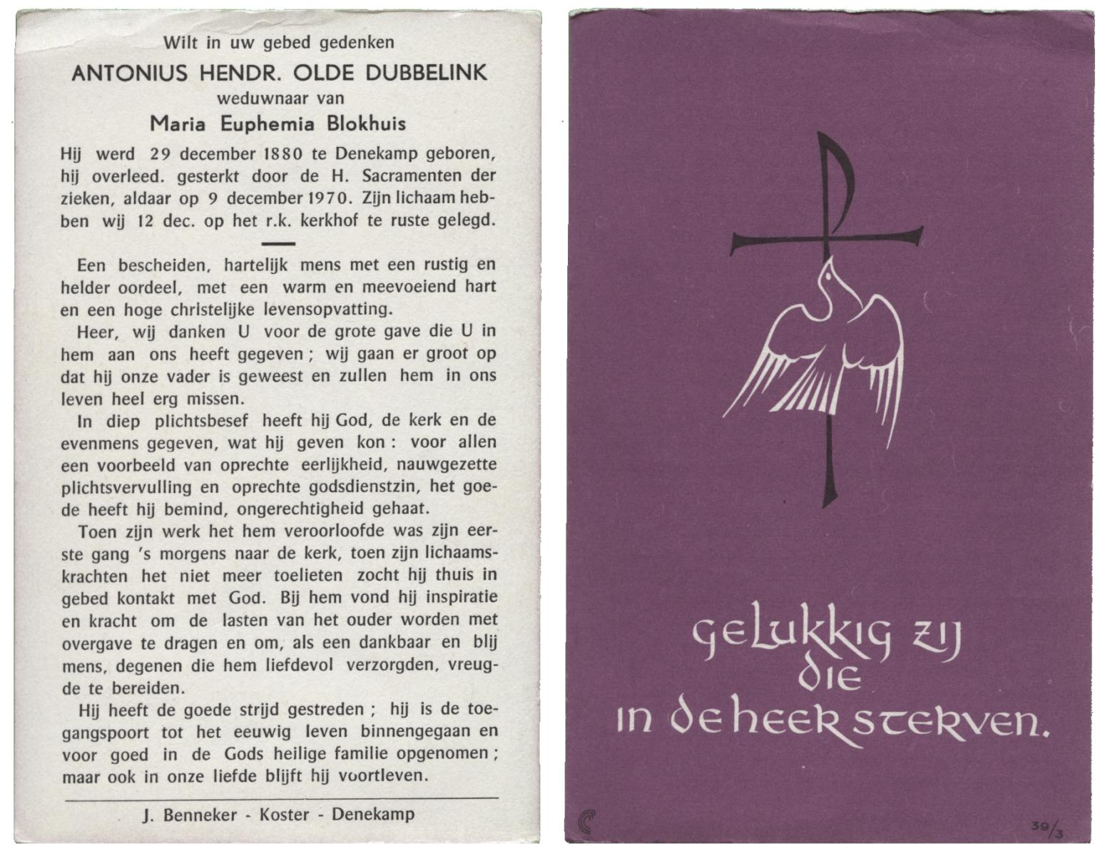 OLDE DUBBELINK, Antonius Hendr., geboren op 29-12-1880 te Denekamp, overleden op 9-12-1970 te Denekamp op 89-jarige leeftijd, begraven op 12-12-1970 te Denekamp.
