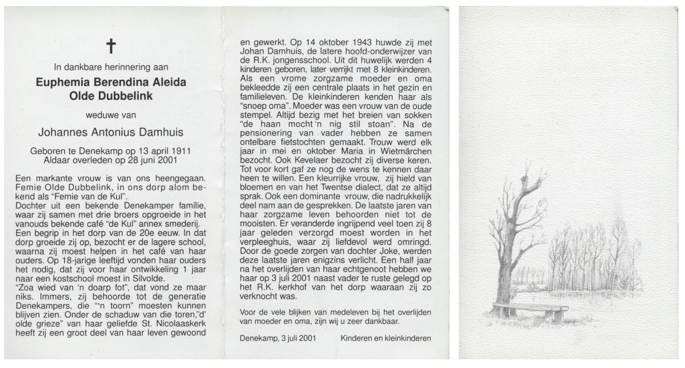 OLDE DUBBELINK, Euphemia Berendina Aleida, geboren op 13-4-1911 te Denekamp, overleden op 28-6-2001 te Denekamp op 90-jarige leeftijd, begraven op 3-7-2001 te Denekamp R.K.kerkhof.