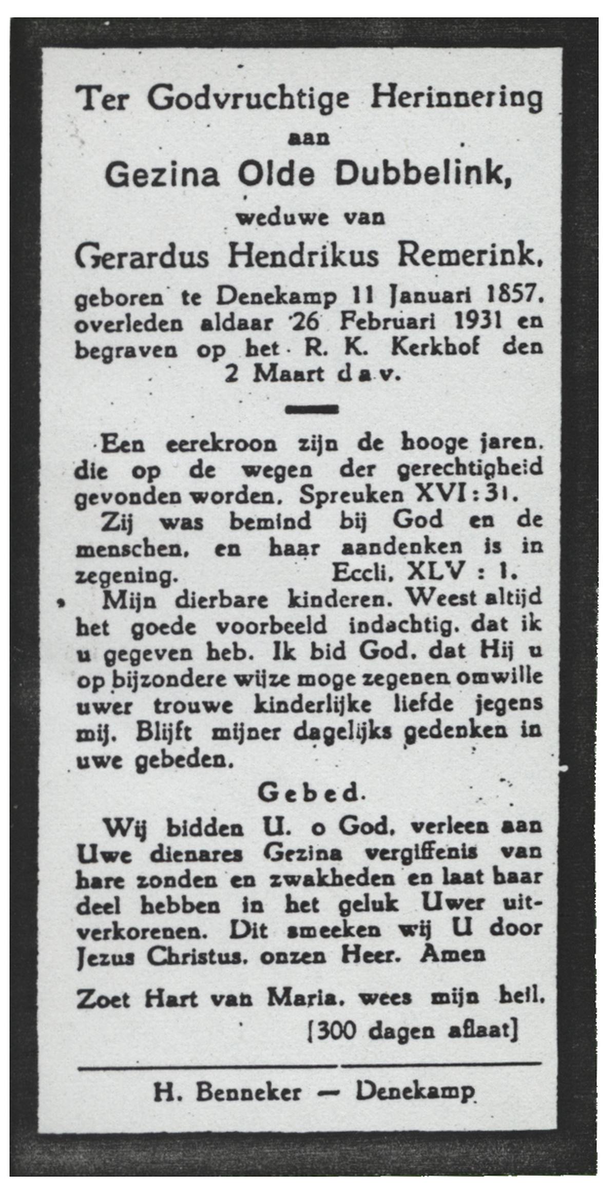 OLDE DUBBELINK, Gezina, geboren op 11-01-1857 te Denekamp, overleden op 26-2-1931 te Denekamp op 74-jarige leeftijd, begraven op 2-3-1931 te Denekamp.