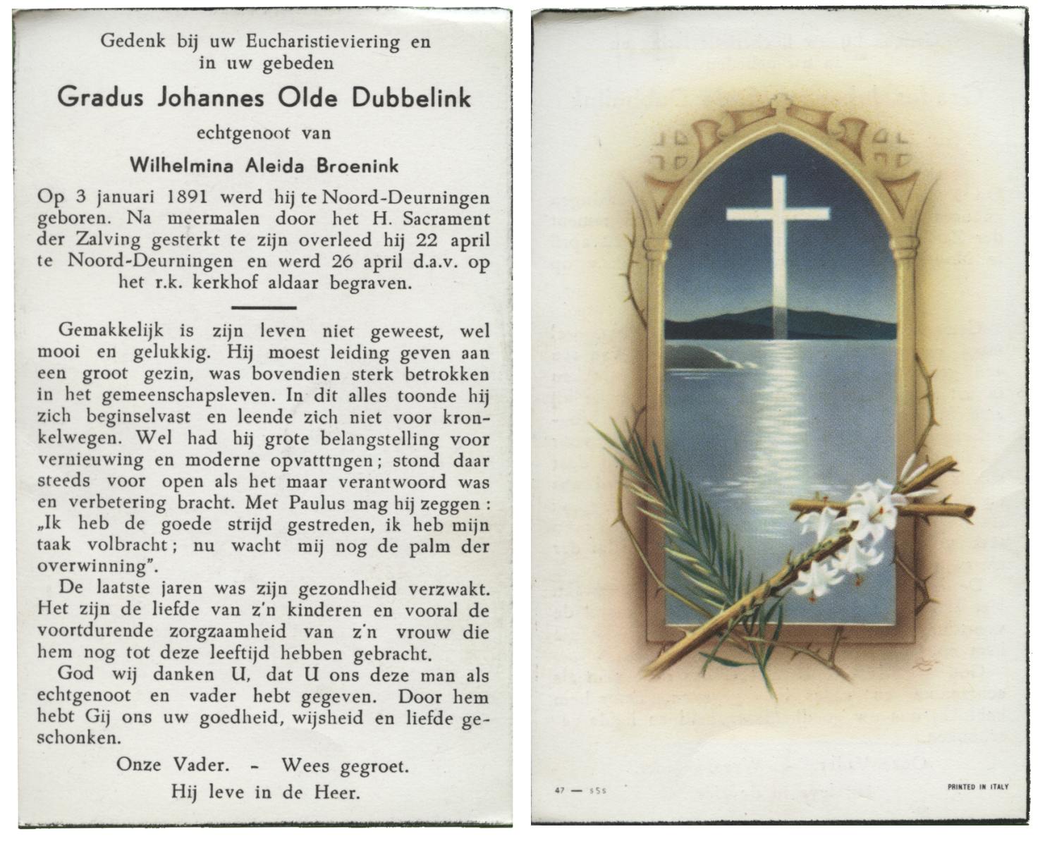 OLDE DUBBELINK, Gradus Johannes, geboren op 03-01-1891 te Noord Deurningen, overleden op 22-04-?? te Noord Deurningen, begraven op 26-04-?? te Noord Deurningen.