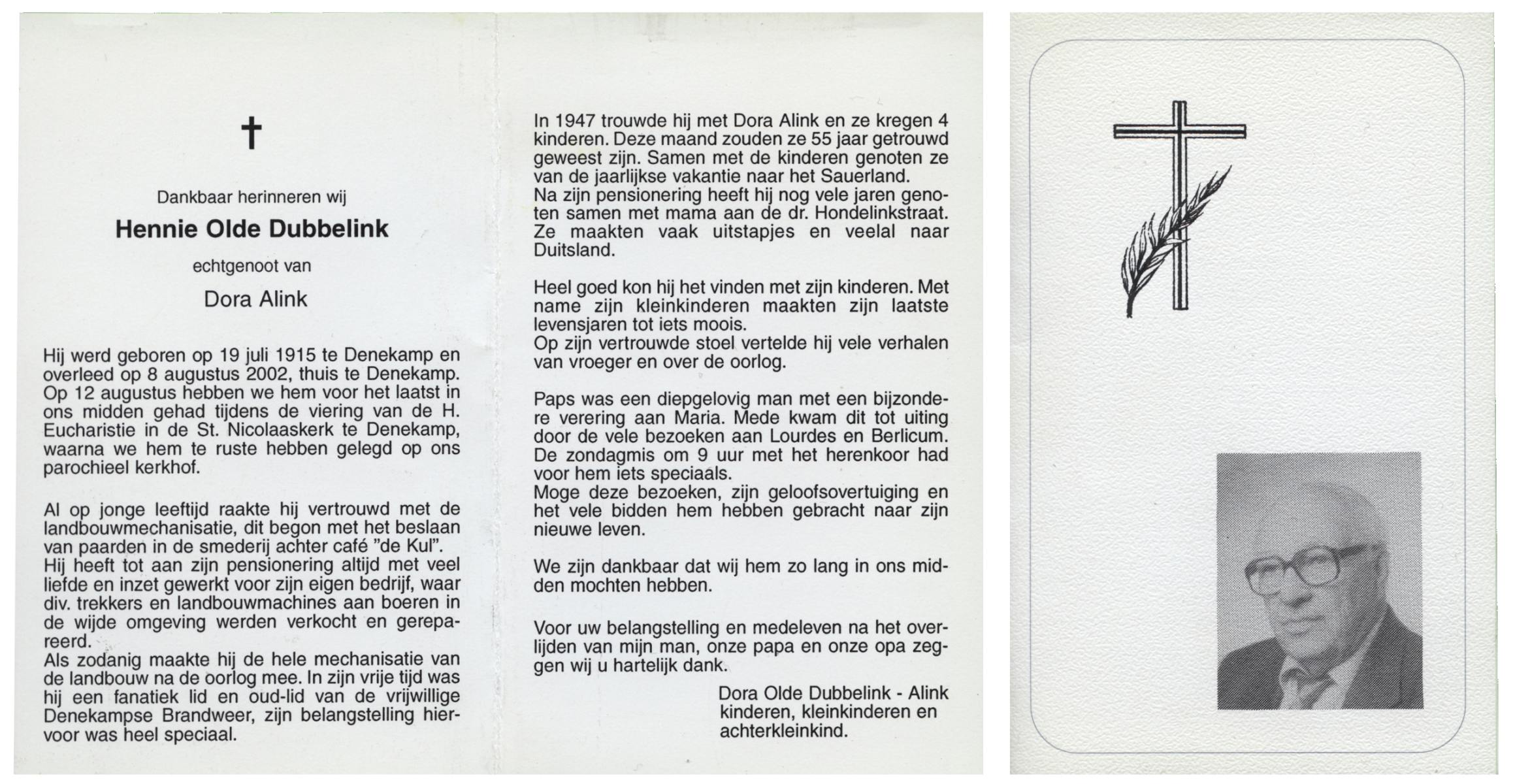 OLDE DUBBELINK, Hennie, geboren op 19-7-1915 te Denekamp, overleden op 8-8-2002 te Denekamp op 87-jarige leeftijd, begraven op 12-8-2002 te Denekamp.
