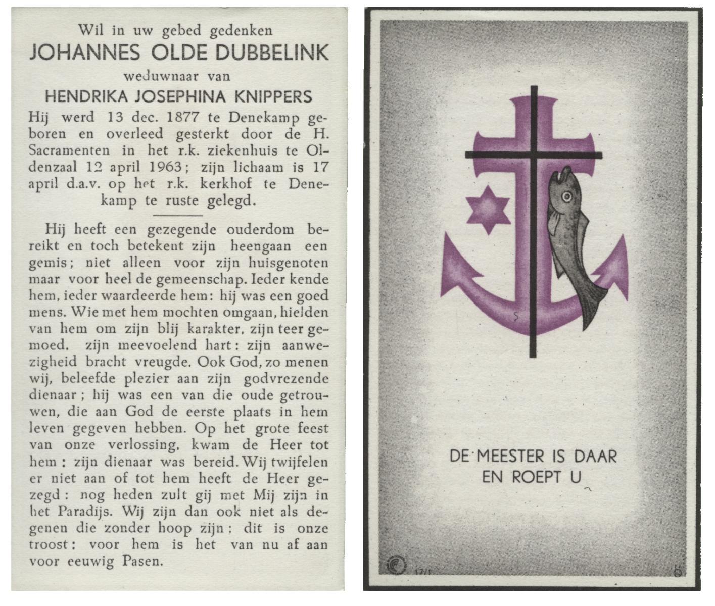 OLDE DUBBELINK, Johannes, geboren op 13-12-1877 te Denekamp, overleden op 12-4-1963 te Oldenzaal op 85-jarige leeftijd, begraven op 17-4-1963 te Denekamp.