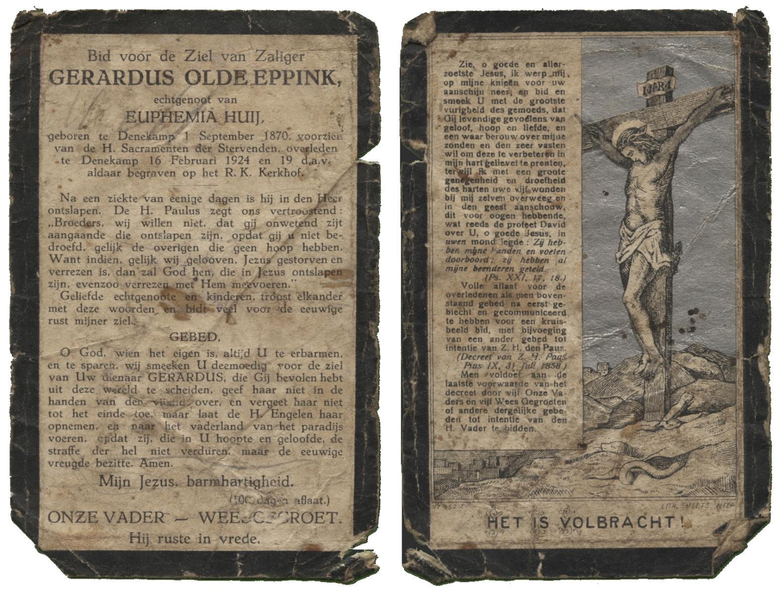 OLDE EPPINK, Gerardus, geboren op 01-09-1870 te Denekamp, overleden op 16-2-1924 te Denekamp op 53-jarige leeftijd, begraven op 19-2-1924 te Denekamp.