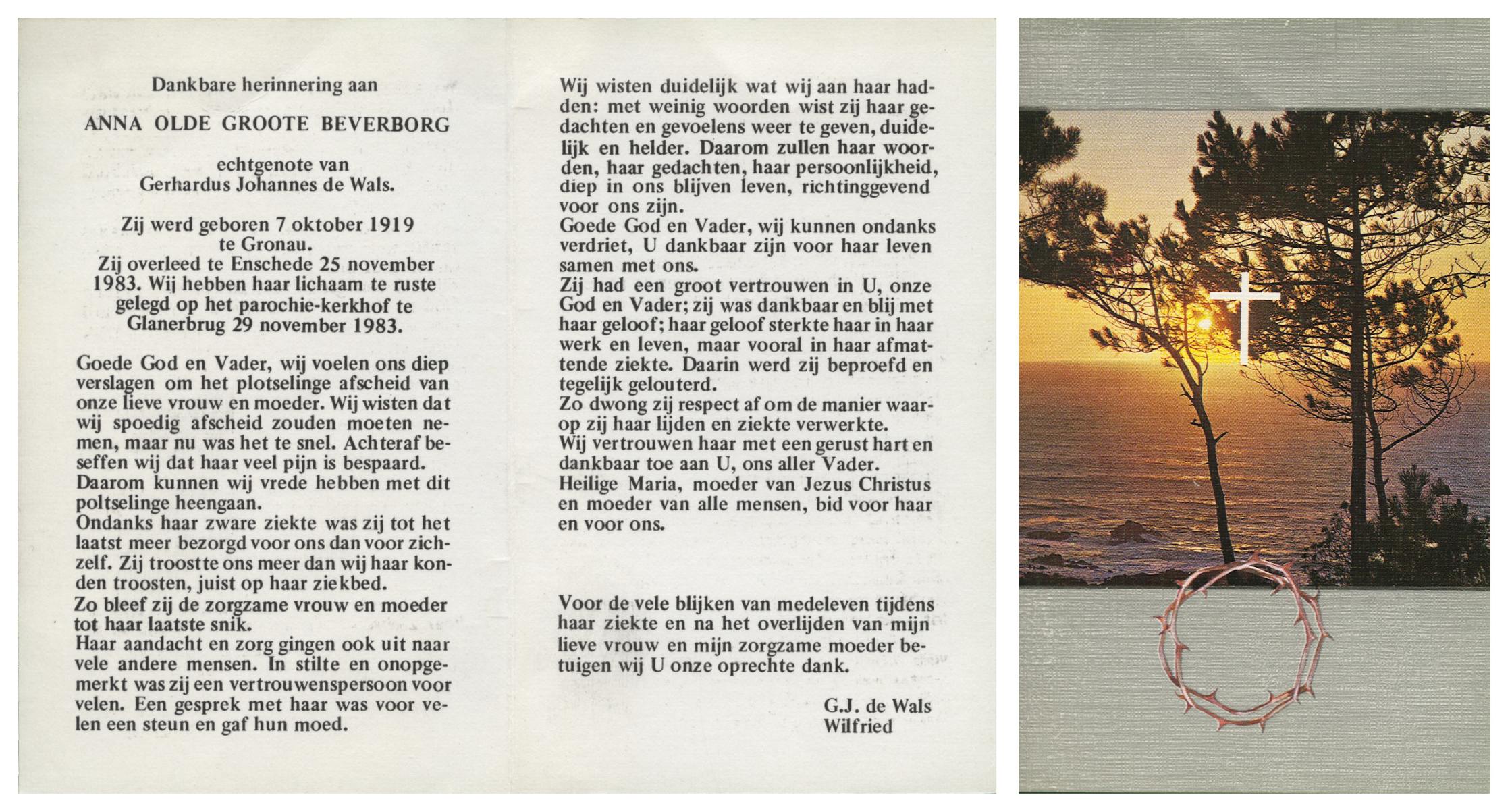 OLDE GROOTE BEVERBORG, Anna, geboren op 7-10-1919 te Gronau (Dld.), overleden op 25-11-1983 te Enschede op 64-jarige leeftijd, begraven op 29-11-1983 te Glanerbrug.