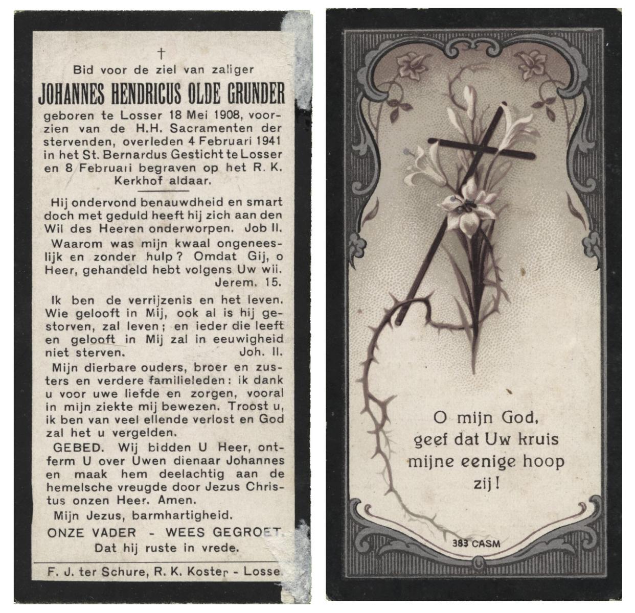 OLDE GRUNDER, Johannes Hendricus, geboren op 18-5-1908 te Losser, overleden op 4-2-1941 te Losser op 32-jarige leeftijd, begraven op 8-2-1941 te Losser.