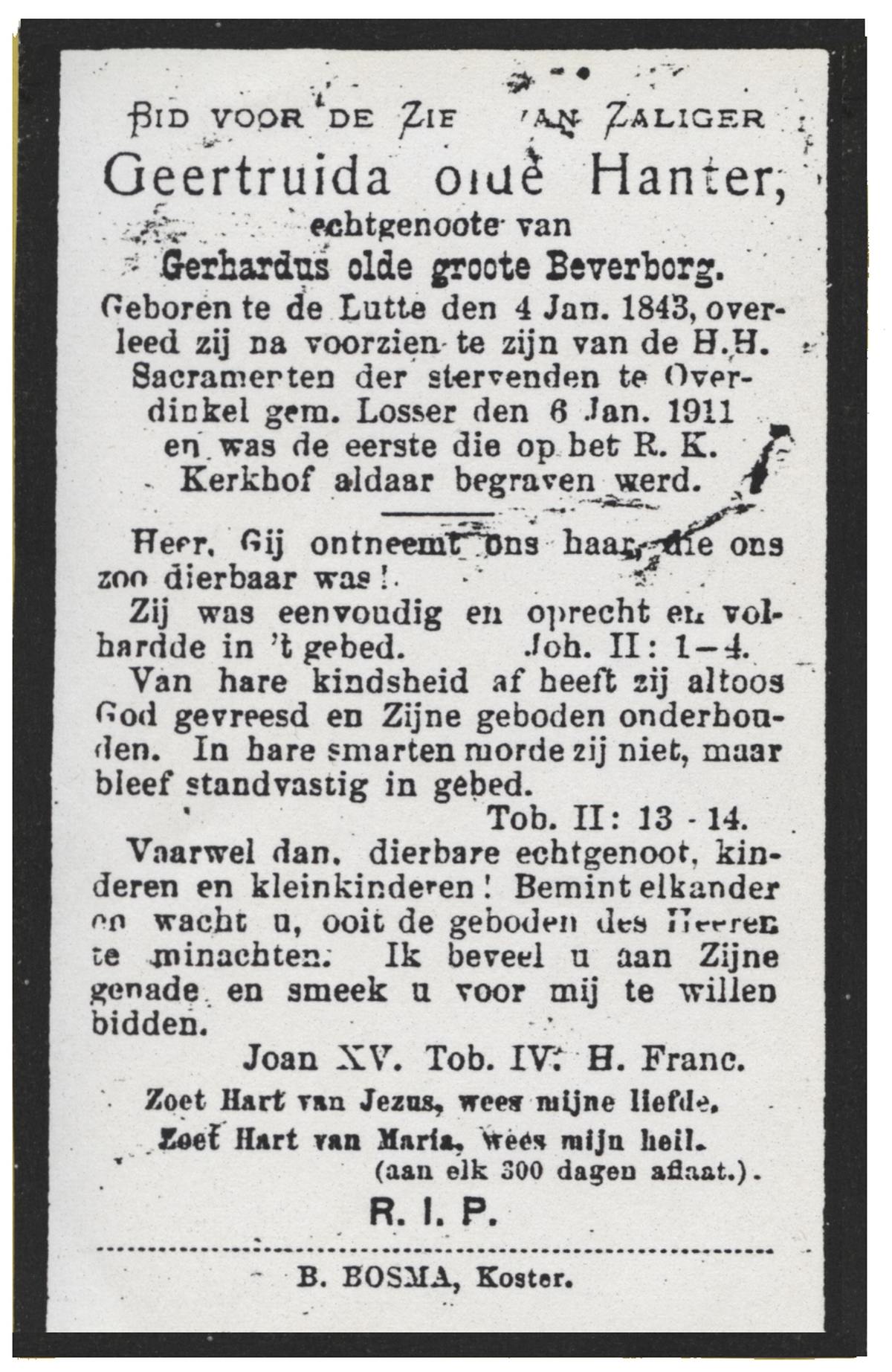 OLDE HANTER, Geertruida, geboren op 04-01-1843 te De Lutte, overleden op 6-1-1911 te Losser op 68-jarige leeftijd, begraven te Losser.