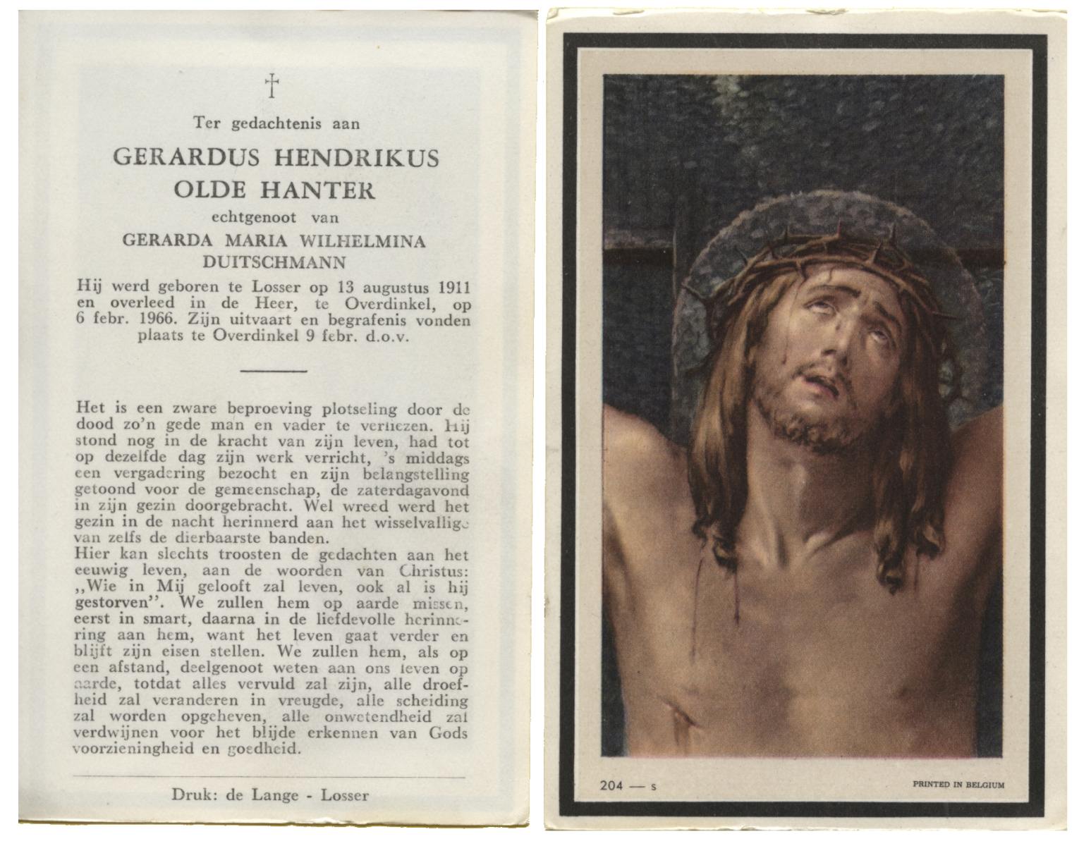 OLDE HANTER, Gerardus Hendrikus, geboren op 13-8-1911 te Losser, overleden op 6-2-1966 te Overdinkel op 54-jarige leeftijd, begraven op 9-2-1966 te Overdinkel.