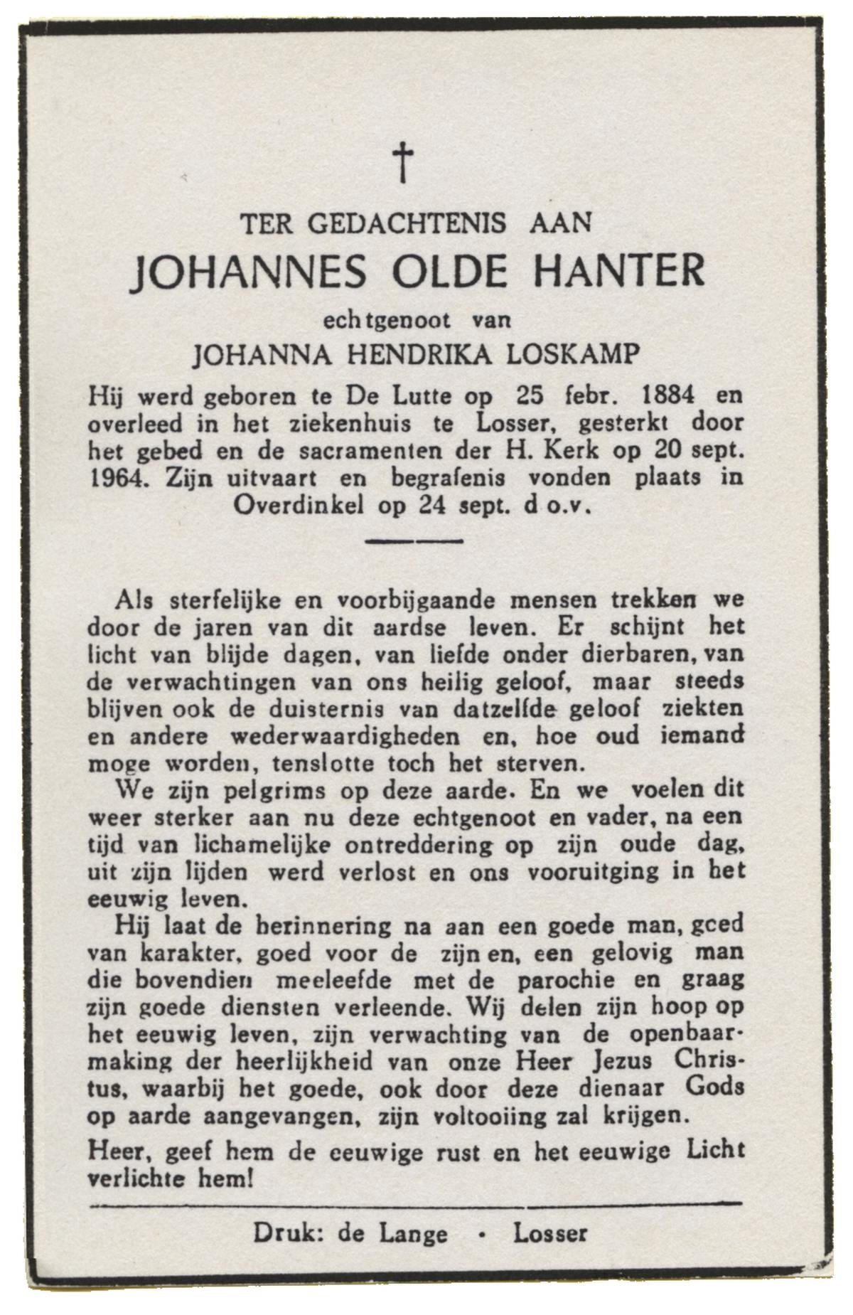 OLDE HANTER, Johannes, geboren op 25-02-1884 te De Lutte, overleden op 20-9-1964 te Losser op 79-jarige leeftijd, begraven op 24-9-1964 te Overdinkel.