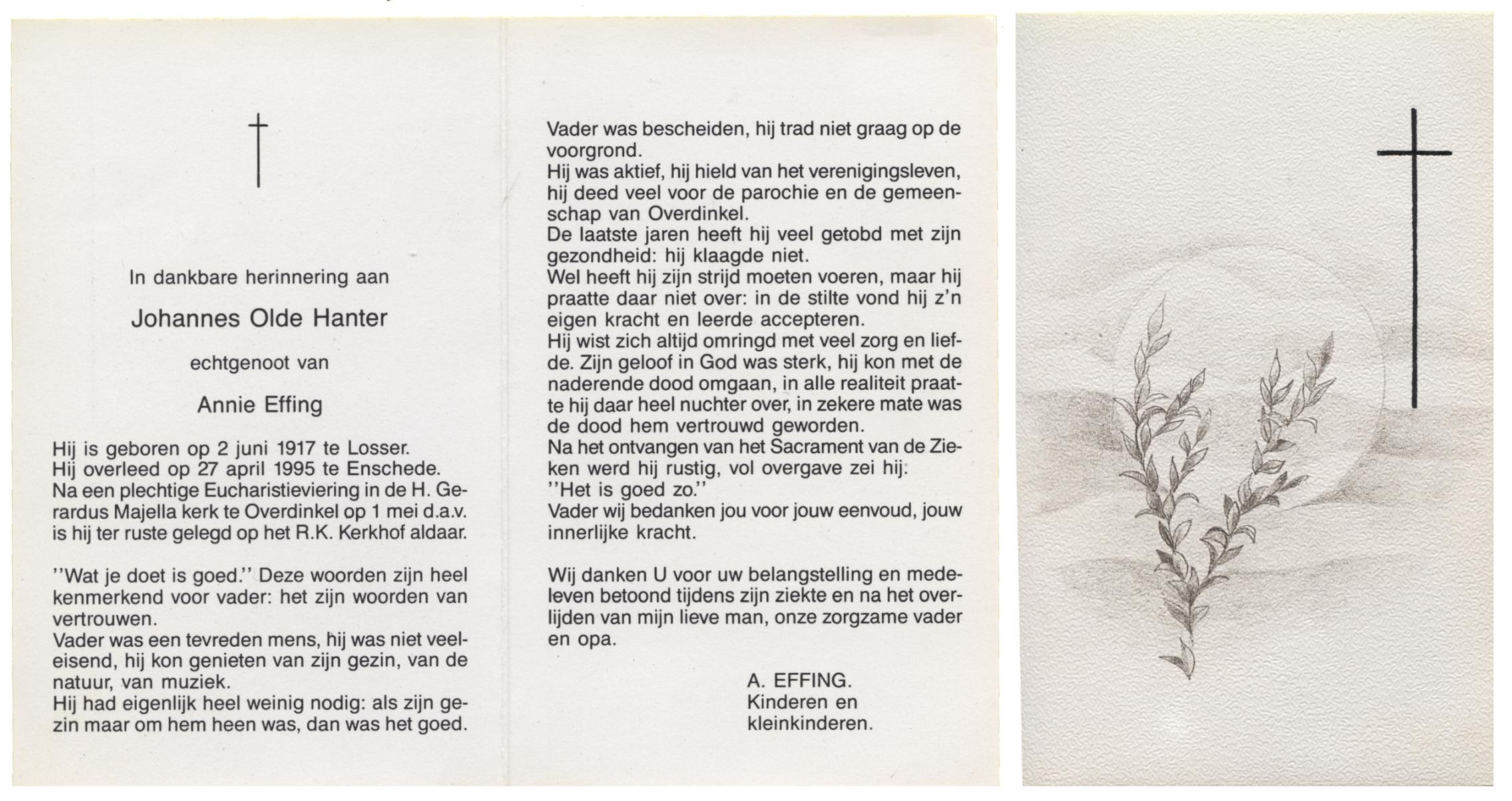 OLDE HANTER, Johannes, geboren op 2-6-1917 te Losser, overleden op 27-4-1995 te Enschede op 77-jarige leeftijd, begraven op 1-5-1995 te Overdinkel.