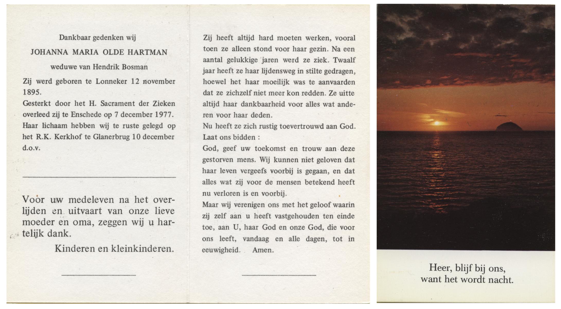OLDE HARTMAN, Johanna Maria, geboren op 12-11-1895 te Lonneker, overleden op 7-12-1977 te Enschede op 82-jarige leeftijd, begraven op 10-12-1977 te Glanerbrug.