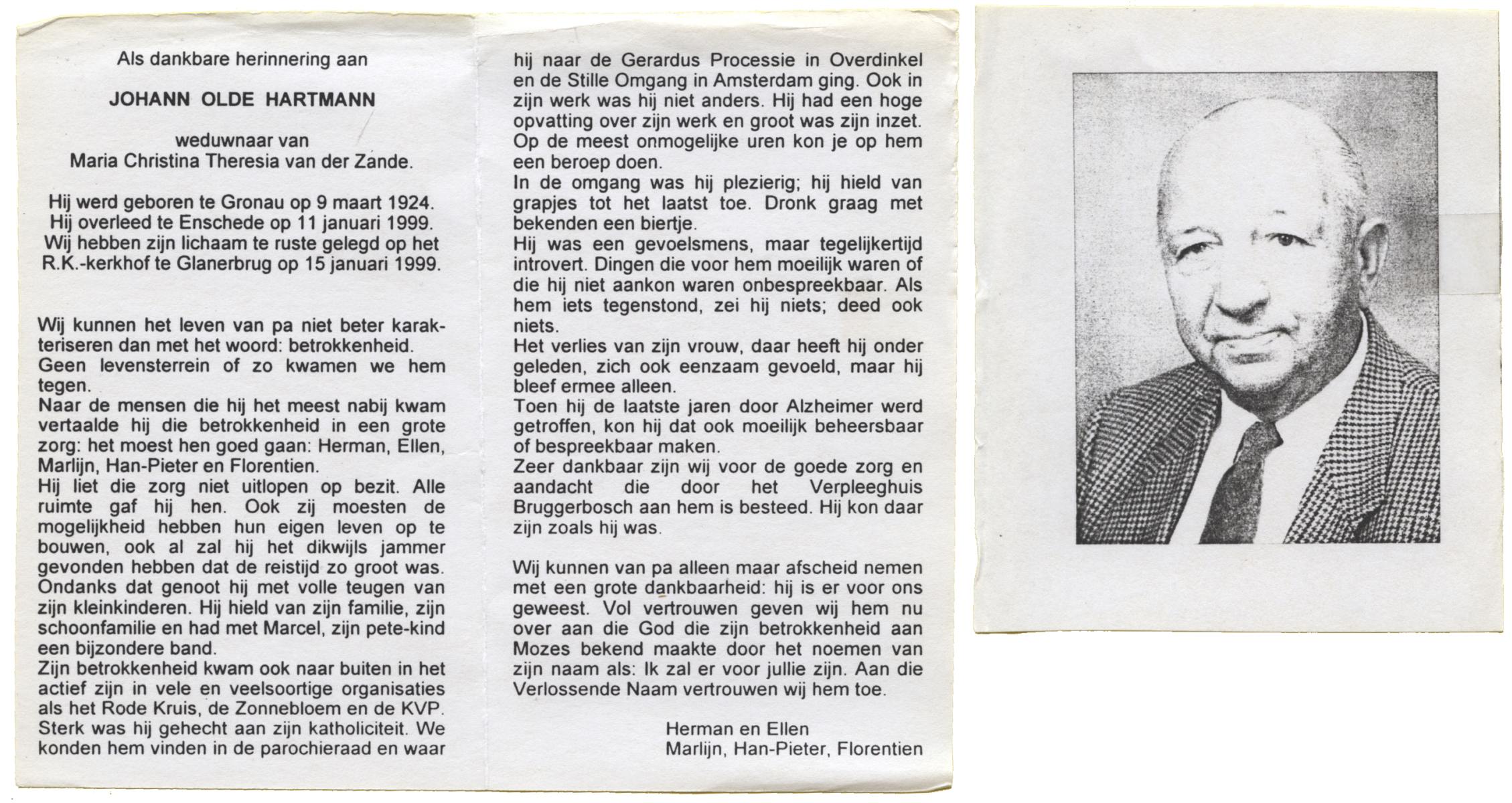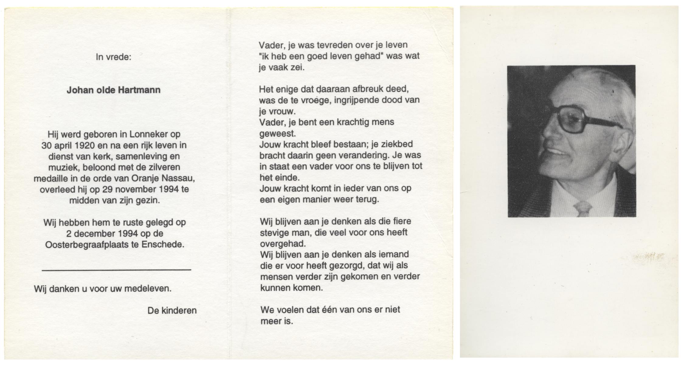 OLDE HARTMANN, Johan, geboren op 30-4-1920 te Lonneker, overleden op 29-11-1994 te Enschede op 74-jarige leeftijd, begraven op 2-12-1994 te Enschede.