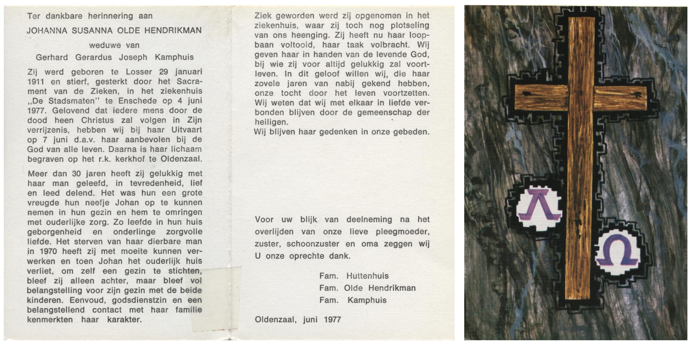 OLDE HENDRIKMAN, Johanna Susanna, geboren op 29-1-1911 te Losser, overleden op 4-6-1977 te Enschede op 66-jarige leeftijd, begraven op 7-6-1977 te Oldenzaal.