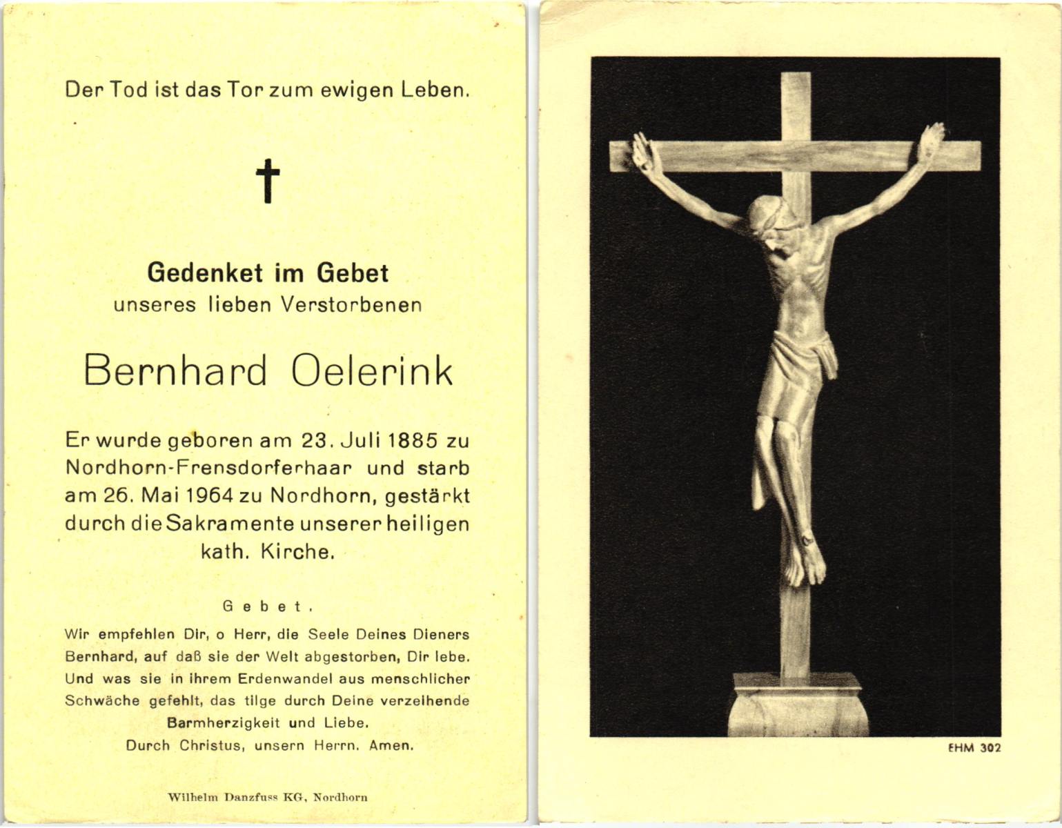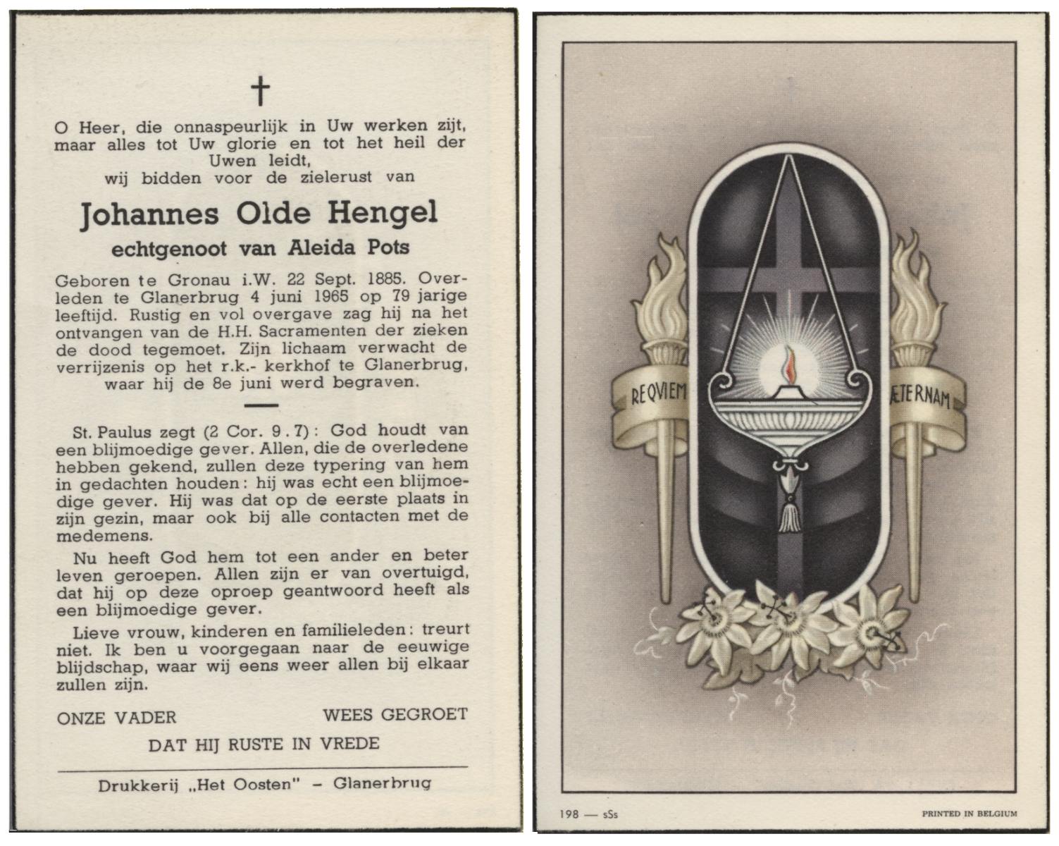 OLDE HENGEL, Johannes, geboren op 22-09-1885 te Gronau (Dld.), overleden op 4-6-1965 te Glanerbrug op 79-jarige leeftijd, begraven op 8-6-1965 te Glanerbrug.