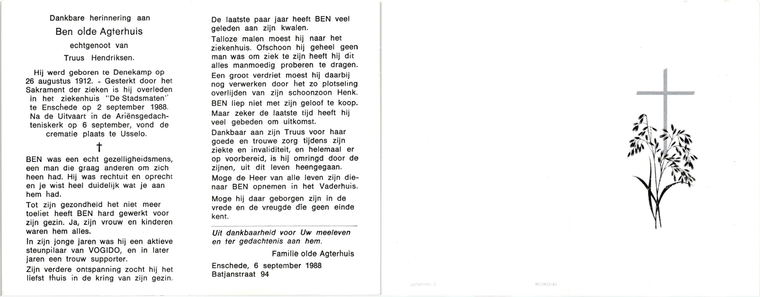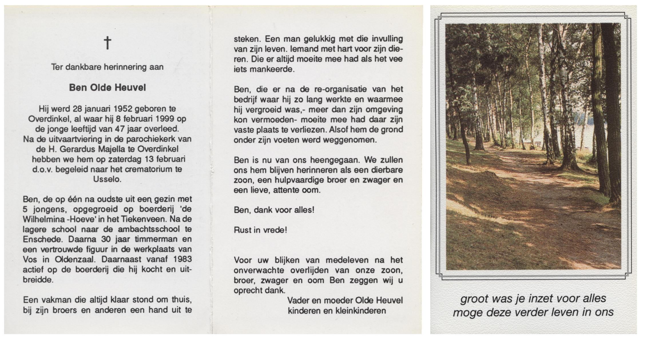 OLDE HEUVEL, Ben, geboren op 28-1-1952 te Overdinkel, overleden op 8-2-1999 te Overdinkel op 47-jarige leeftijd, gecremeerd op 13-2-1999 te Usselo.