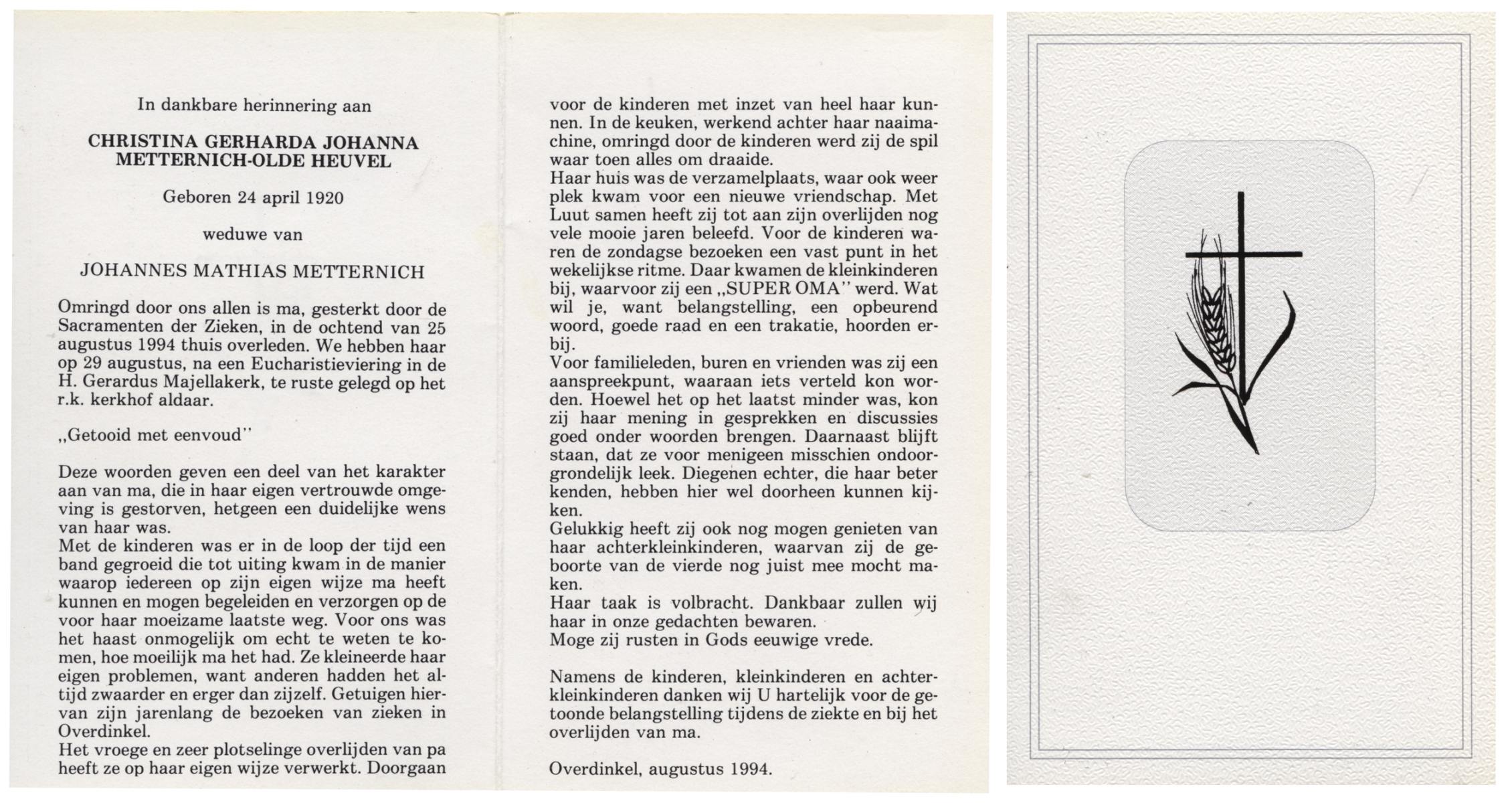 OLDE HEUVEL, Christina Gerharda Johanna, geboren op 24-4-1920, overleden op 25-8-1994 te Overdinkel op 74-jarige leeftijd, begraven op 29-8-1994 te Overdinkel.