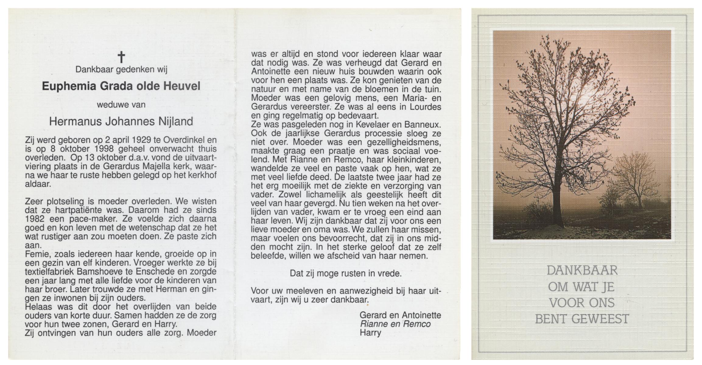 OLDE HEUVEL, Euphemia Grada, geboren op 2-4-1929 te Overdinkel, overleden op 8-10-1998 op 69-jarige leeftijd, begraven op 13-10-1998 te Overdinkel.