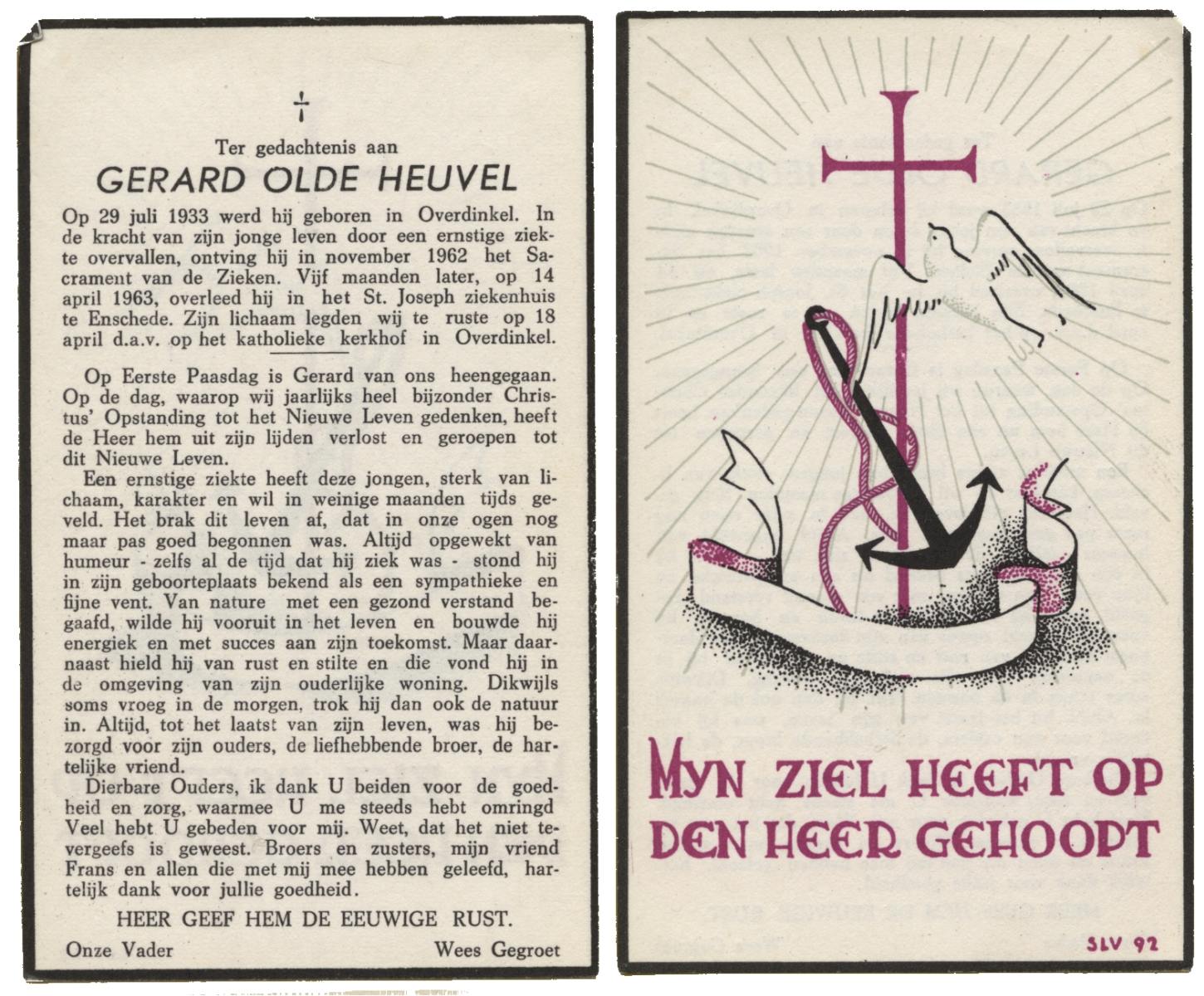 OLDE HEUVEL, Gerard, geboren op 29-7-1933 te Overdinkel, overleden op 14-4-1963 te Enschede op 29-jarige leeftijd, begraven op 18-4-1963 te Overdinkel.