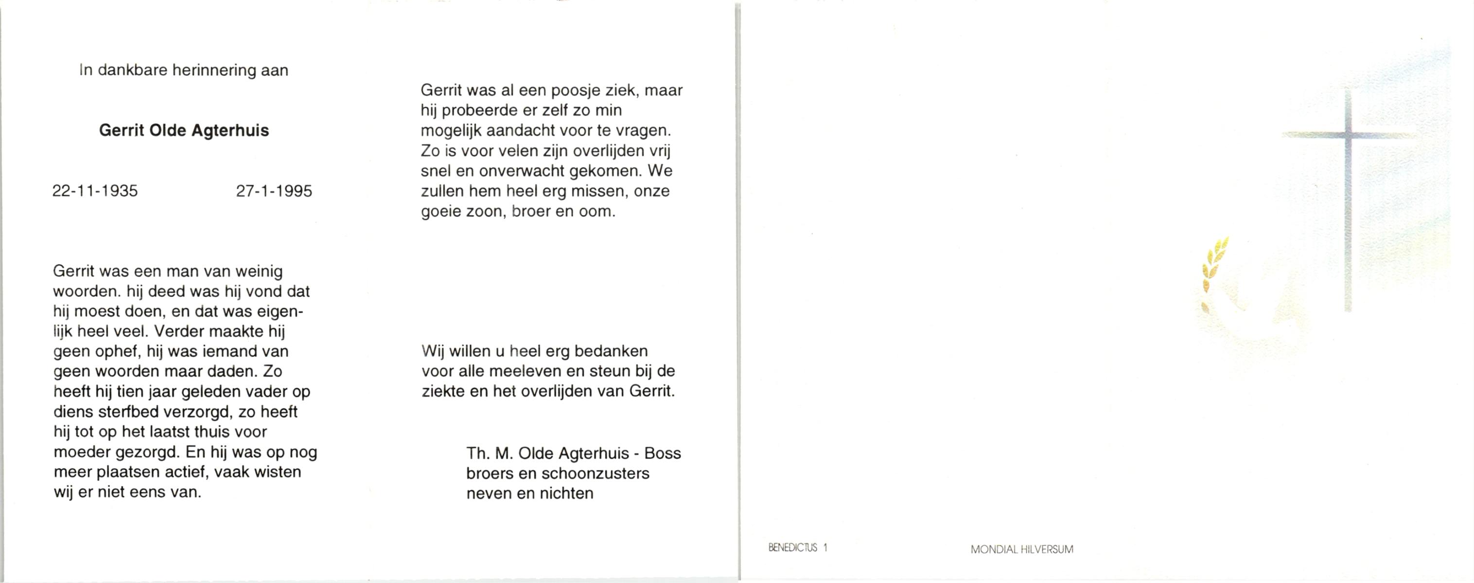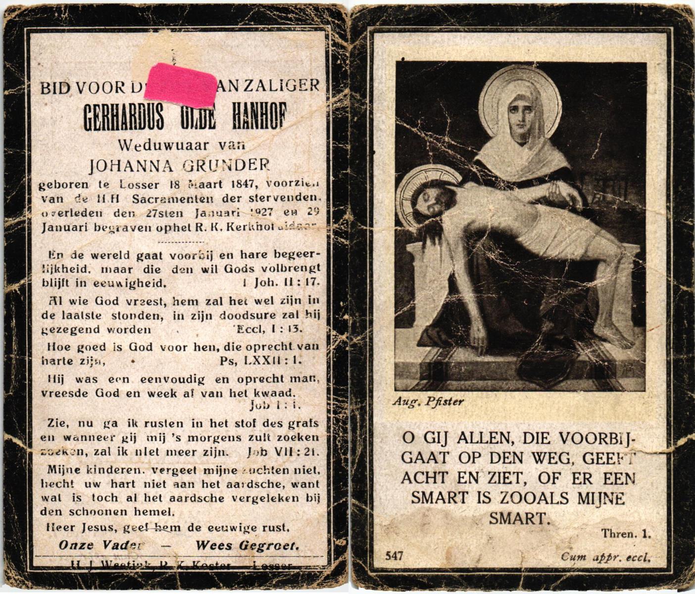 OLDE HANHOF, Gerhardus, geboren op 18-03-1847 te Losser, overleden op 27-1-1927 te Losser op 79-jarige leeftijd, begraven op 29-1-1927 te Losser.