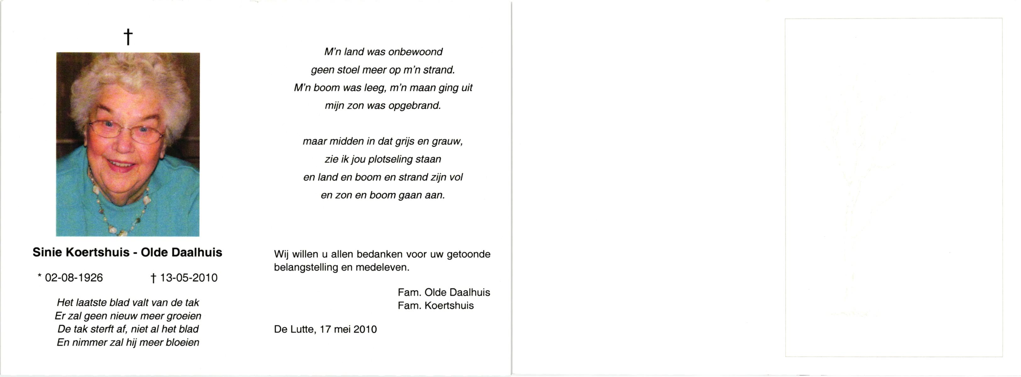 OLDE DAALHUIS, , Sinie, geboren op 2-8-1926, overleden op 13-5-2010 op 83-jarige leeftijd.