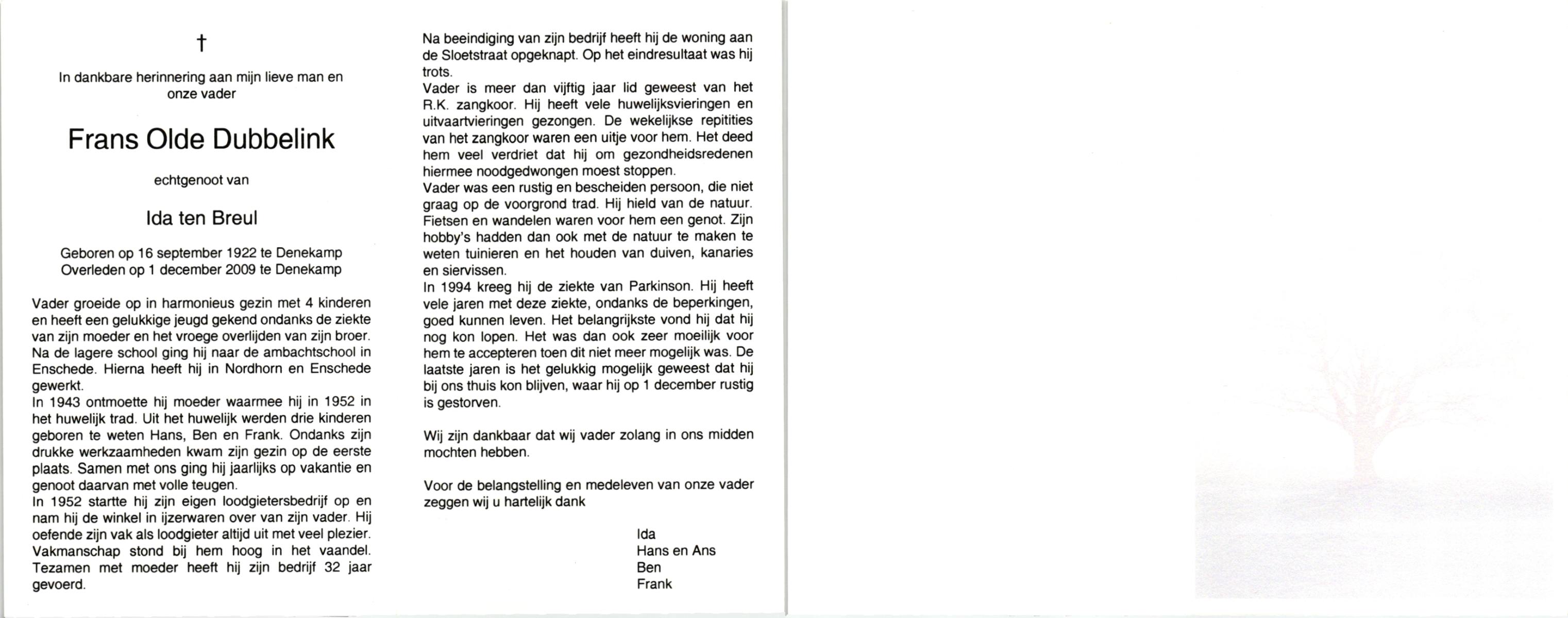 OLDE DUBBELINK, , Frans, geboren op 16-9-1922 te Denekamp, overleden op 1-12-2009 te Denekamp op 87-jarige leeftijd.