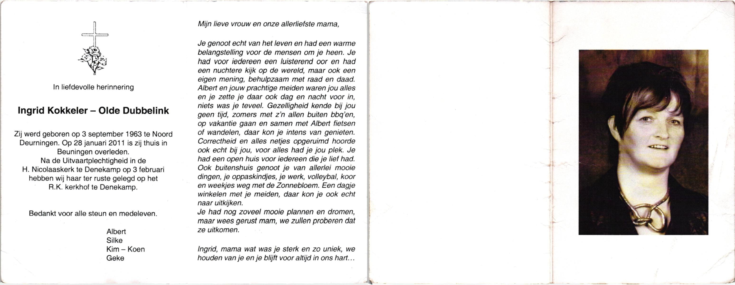 OLDE DUBBELINK, , Ingrid, geboren op 3-9-1963 te Noord Deurningen, overleden op 28-1-2011 te Beuningen op 47-jarige leeftijd, begraven op 3-2-2011 te Denekamp.