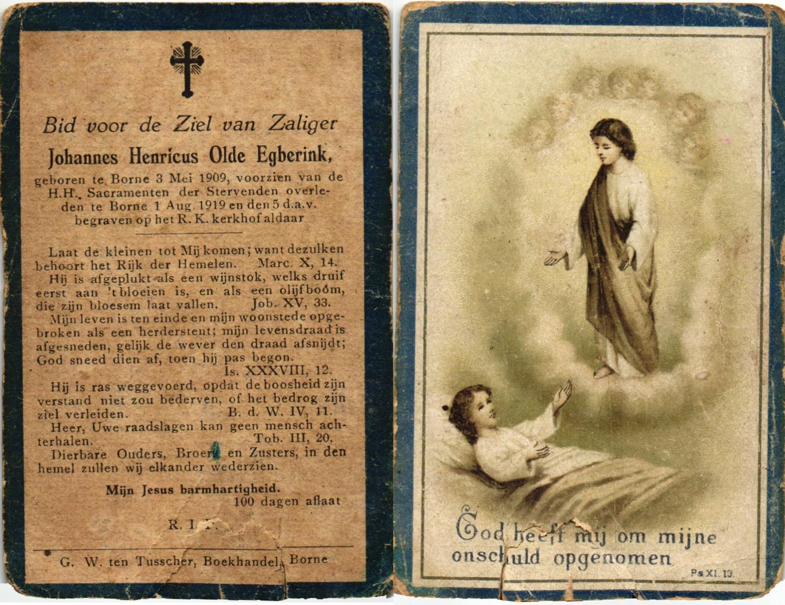 OLDE EGBERINK, , Johannes Henricus, geboren op 3-5-1909 te Borne, overleden op 1-8-1919 te Borne op 10-jarige leeftijd, begraven op 5-8-1919 te Borne.